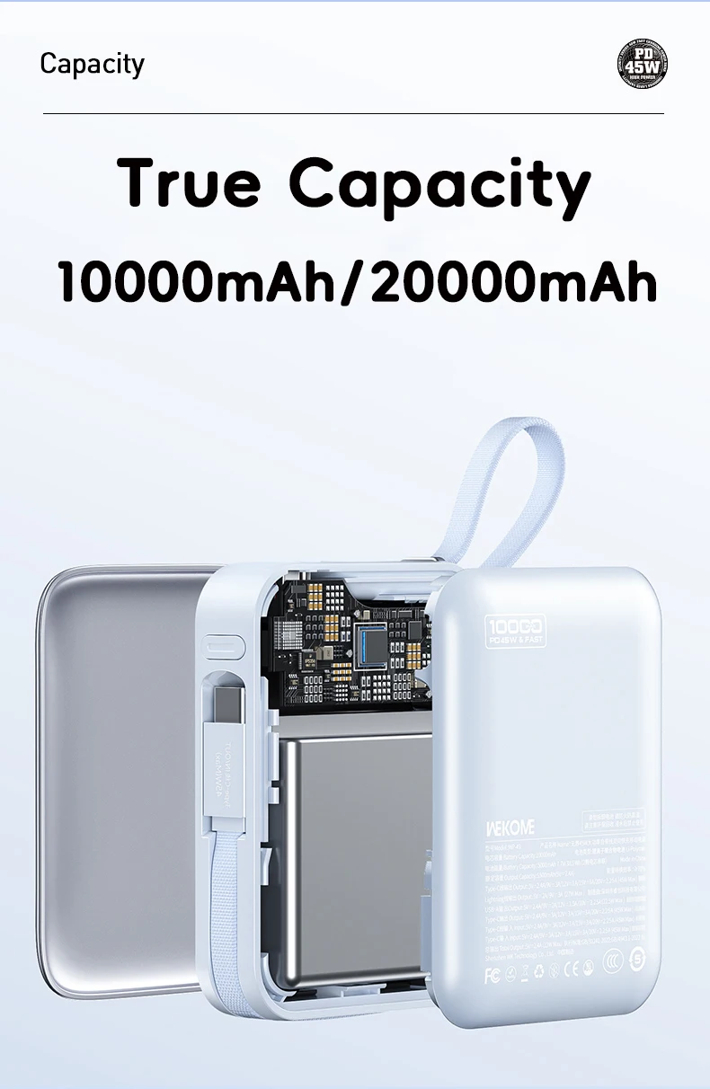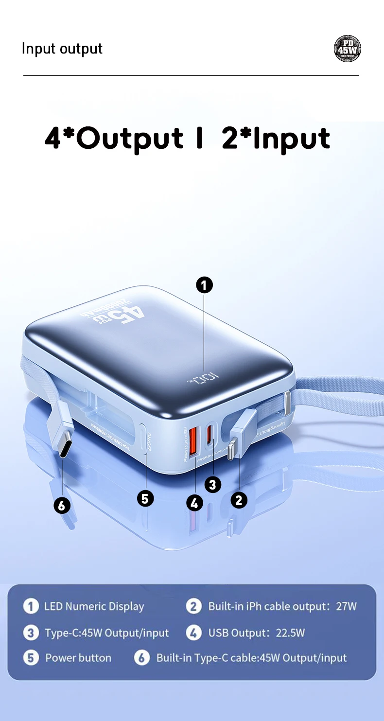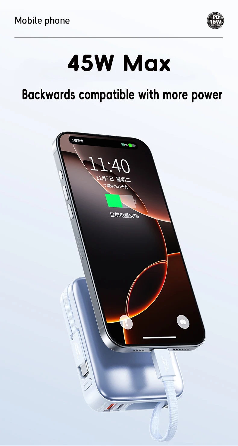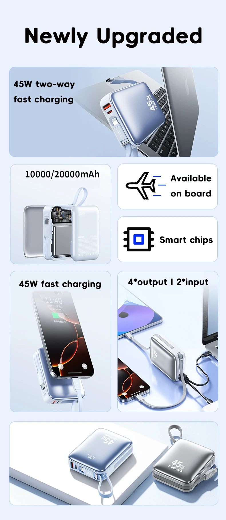 20000mAh 45W PD Large capacity Portable Power Bank 10000mAh Built-in USB Type-C lighting cable Fast Charging External Auxiliary Battery Powerbank for iPhone 16 15 14 13 Samsung Xiaomi HUAWEI Laptop