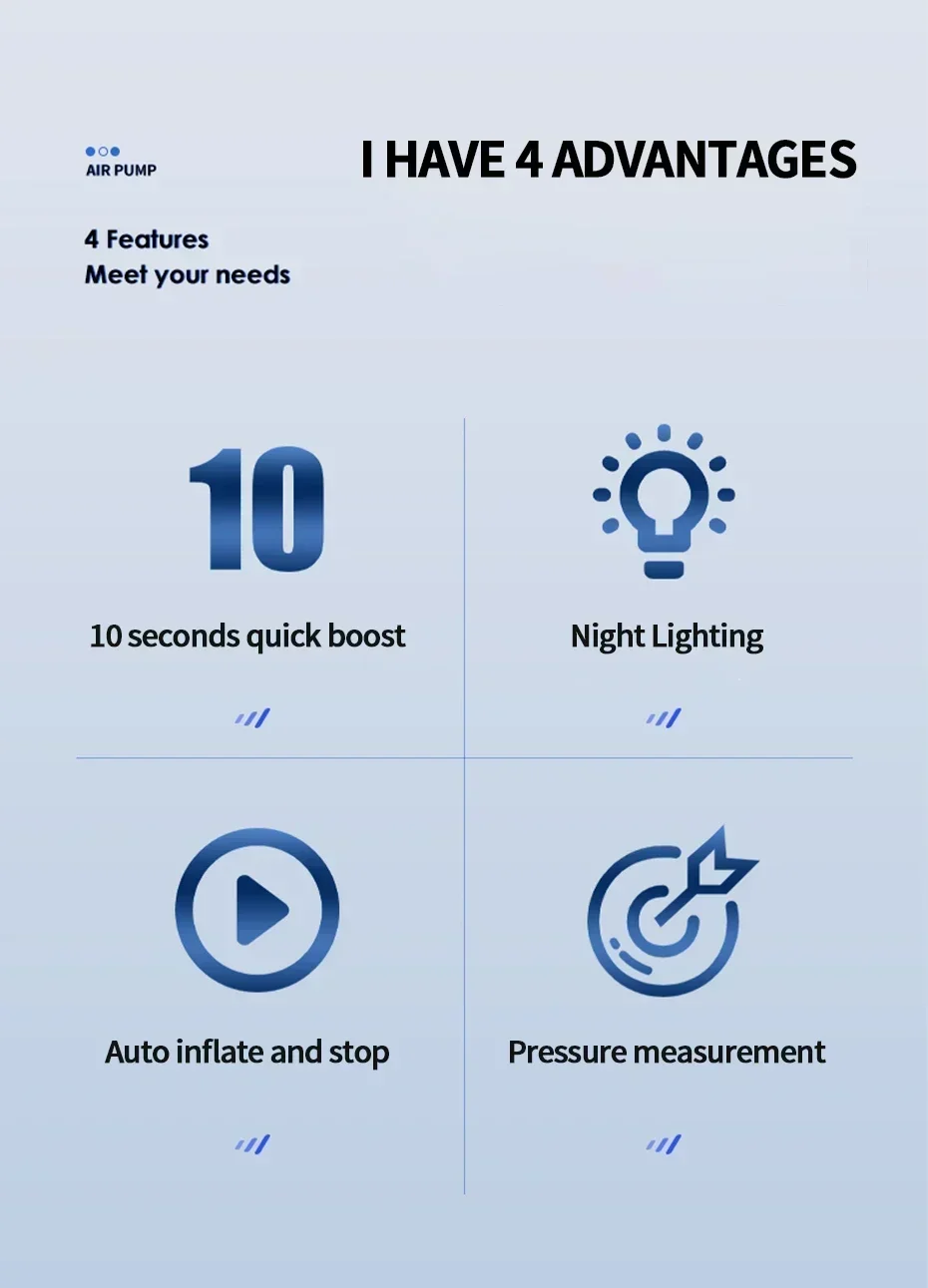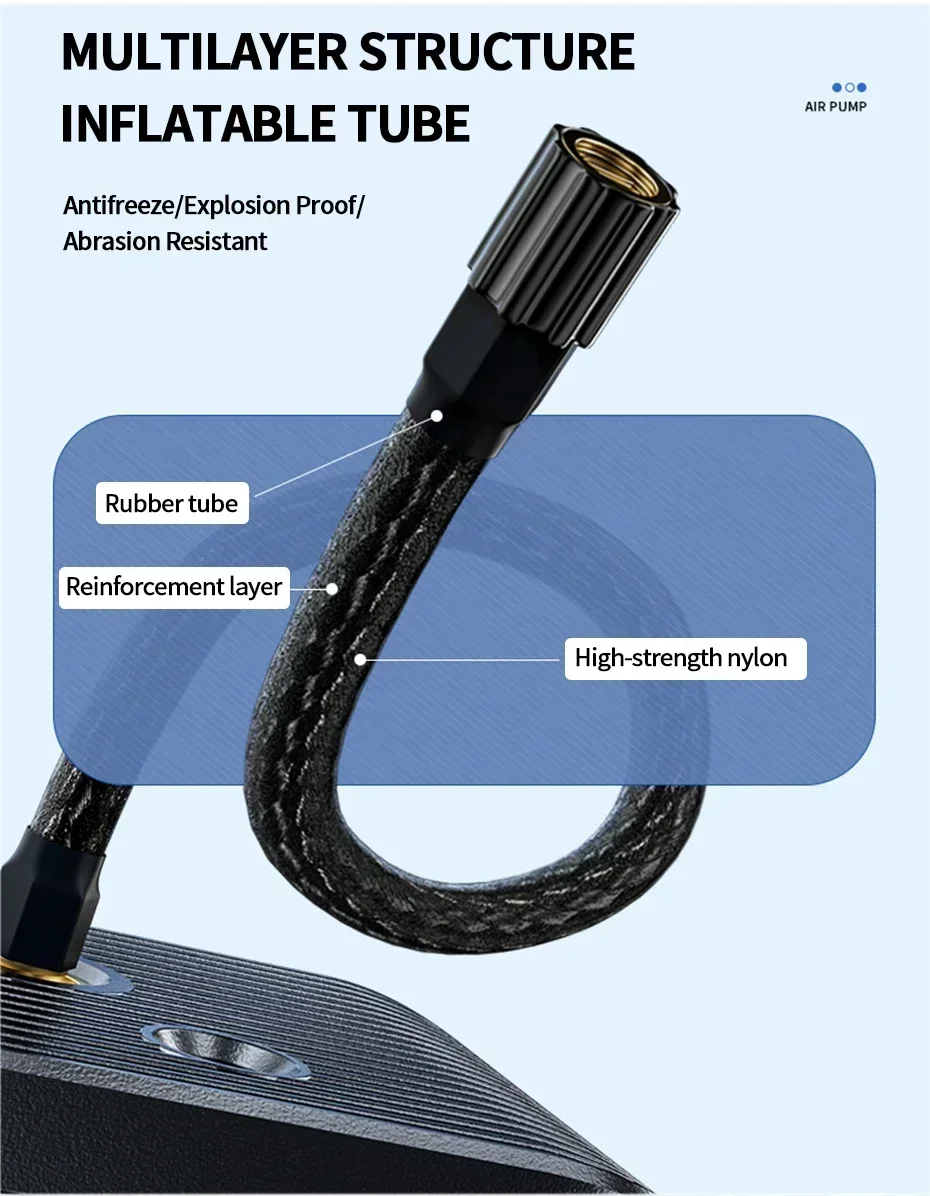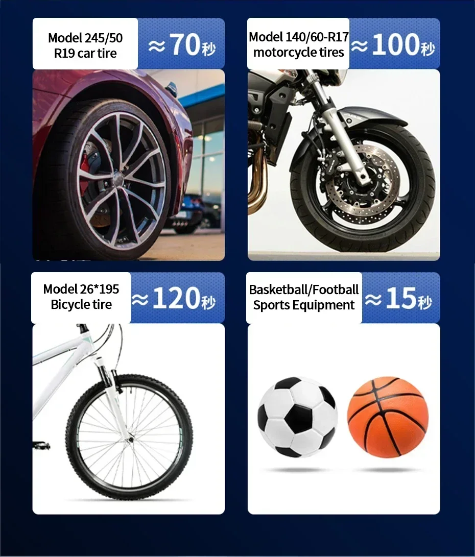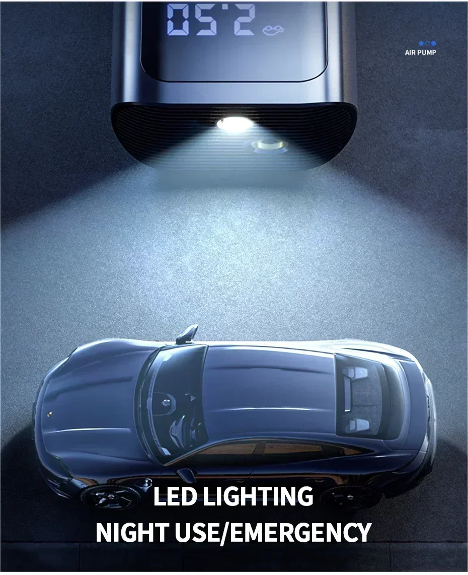 Features: 1. Quick air supply, 60W high-power air pump, 19000+ speed piston runs quickly, and quick air supply in 10 seconds. 2.LED lighting, easy to inflate at night. 3. Accurate pressure measurement, safe tire protection. 4.Automatic charging and stopping, the preset tire pressure is clicked to start, and it will automatically stop when full. 5.Built-in professional shock absorber, double noise reduction, the structure frequency is as low as 40dB.