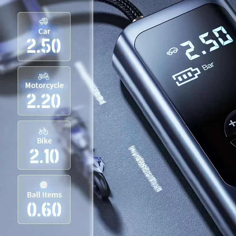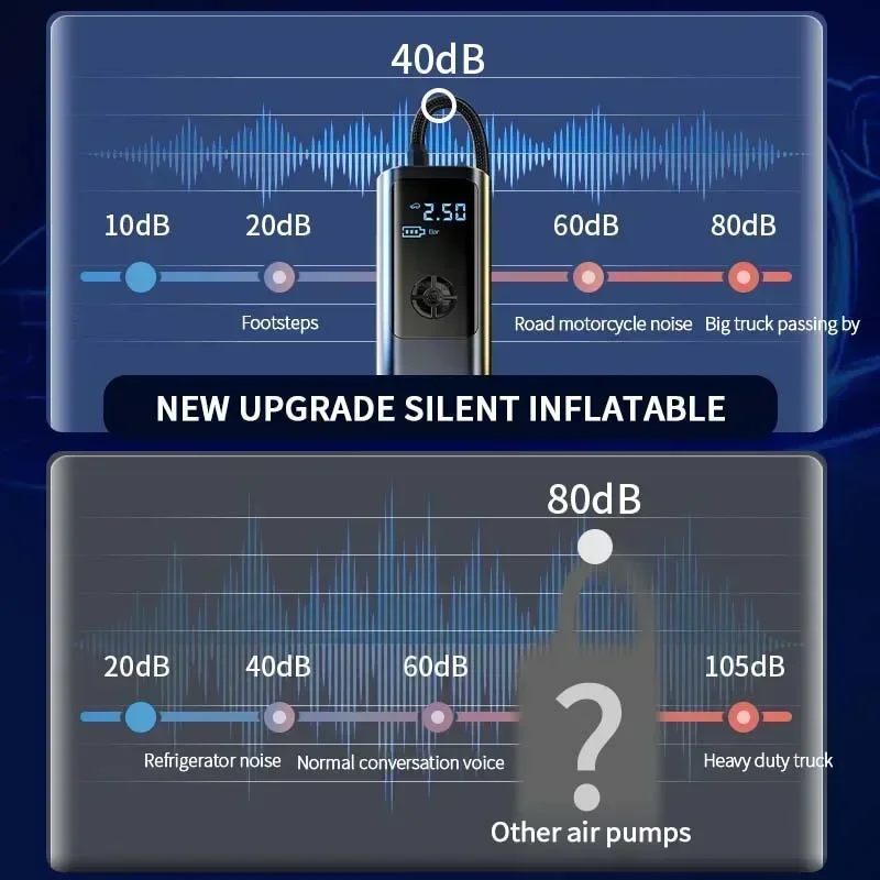 Features: 1. Quick air supply, 60W high-power air pump, 19000+ speed piston runs quickly, and quick air supply in 10 seconds. 2.LED lighting, easy to inflate at night. 3. Accurate pressure measurement, safe tire protection. 4.Automatic charging and stopping, the preset tire pressure is clicked to start, and it will automatically stop when full. 5.Built-in professional shock absorber, double noise reduction, the structure frequency is as low as 40dB.