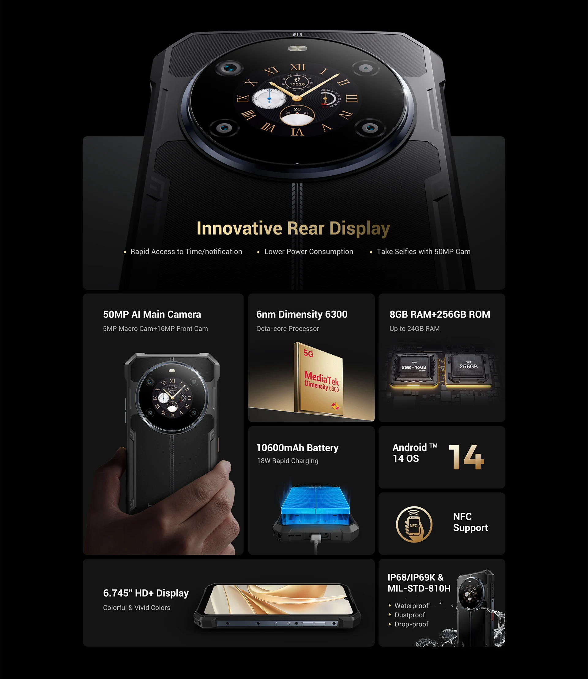 FOSSIBOT F109 Rugged 24GB+256GB 10600mAh 6.745″HD+Android 14 NFC 50MP Cam Dual Screen Face ID Global Version
