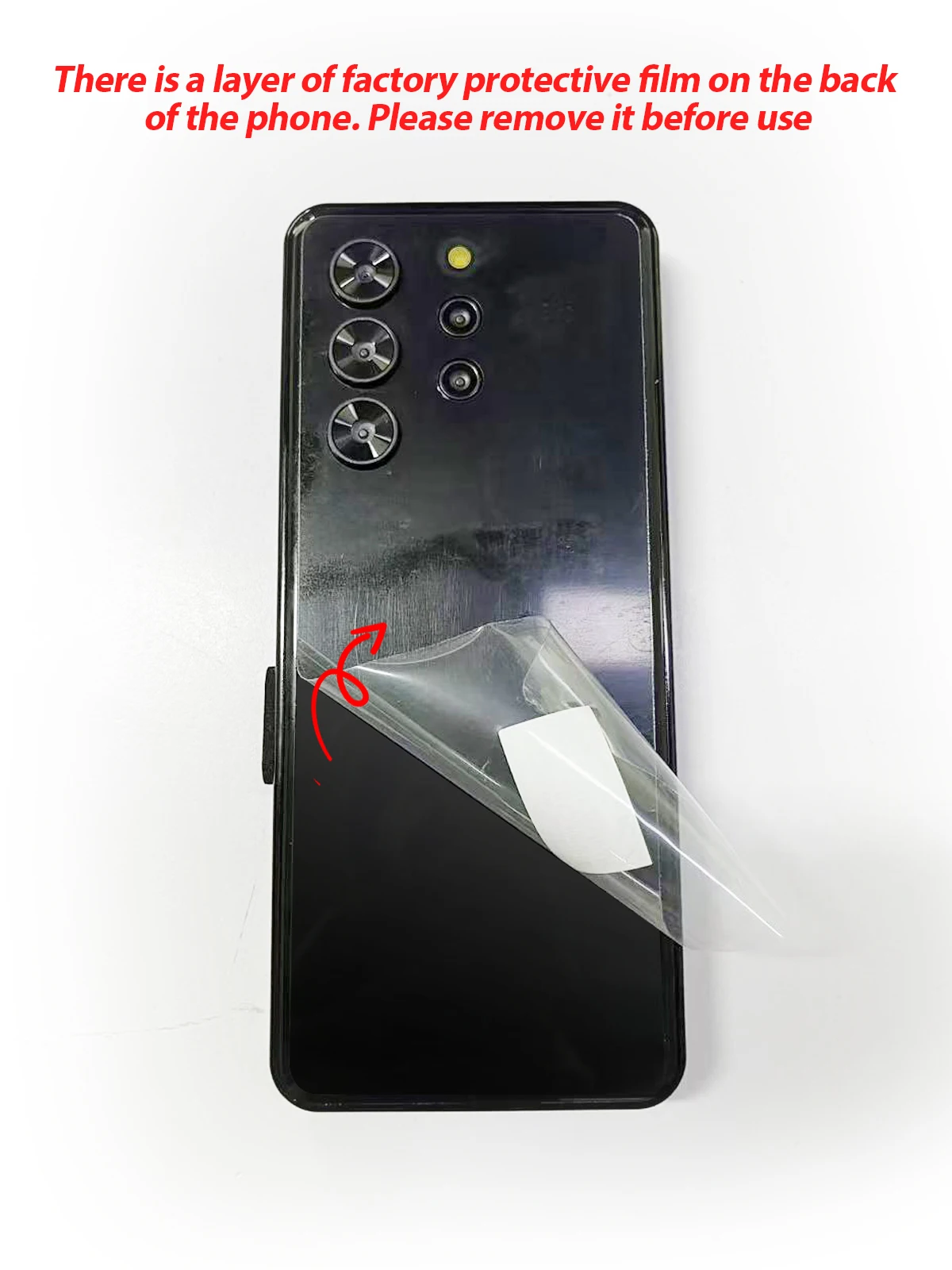 3. There is a layer of factory protective film on the back of the phone. Please remove it before use