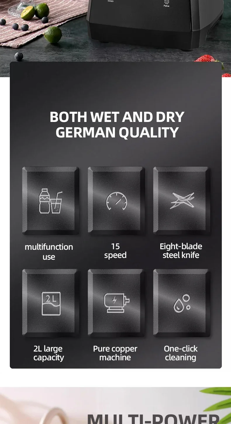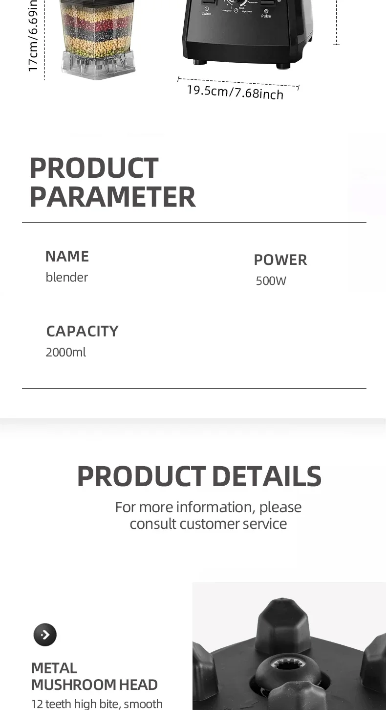 1. One machine with two cups, large cup with 2L capacity, grinding cup with 0.6L capacity; 6-page wall-breaking knife set, more powerful and delicate crushing effect; adopts the wall-breaking effect without residue, and the thickened PC cup is resistant to falling;