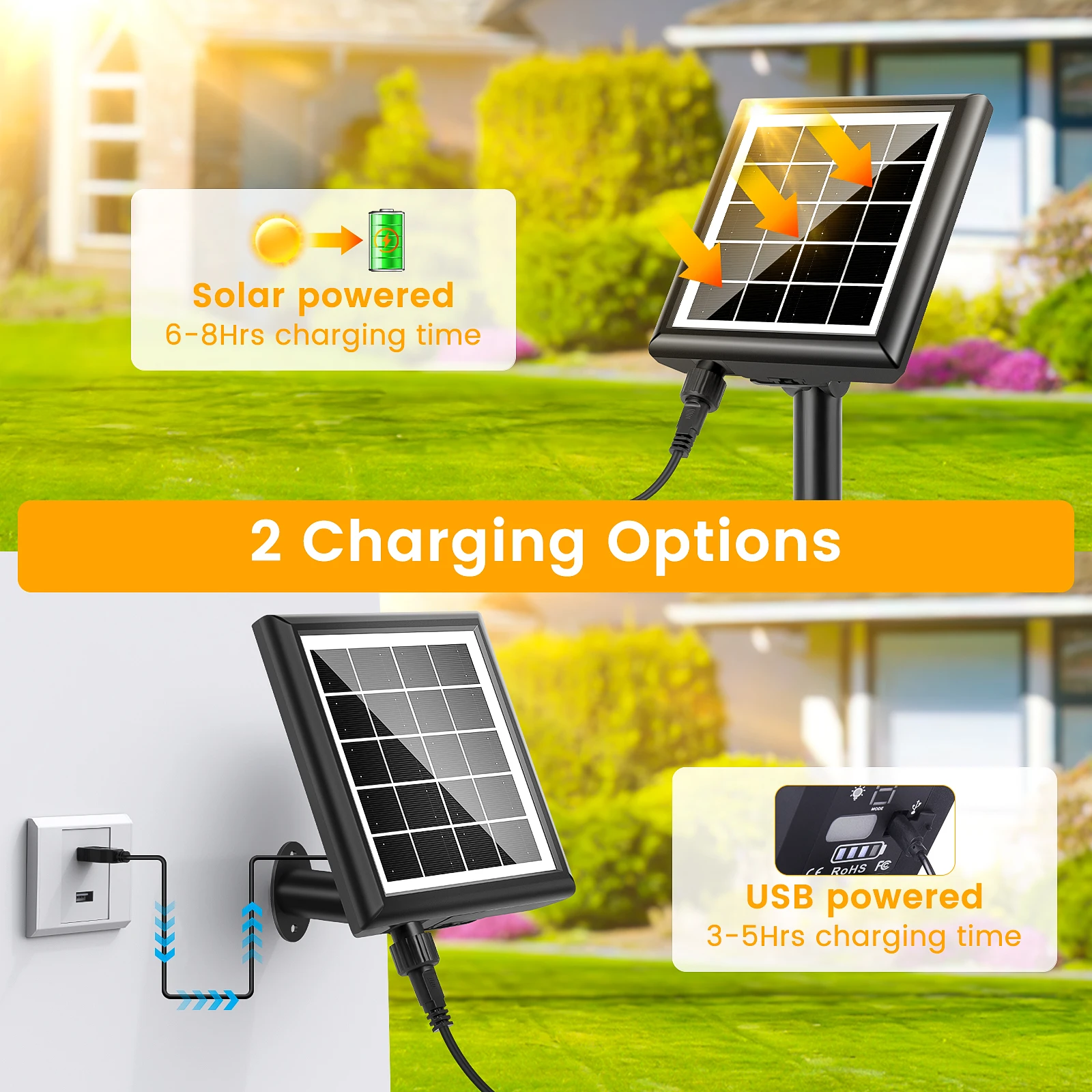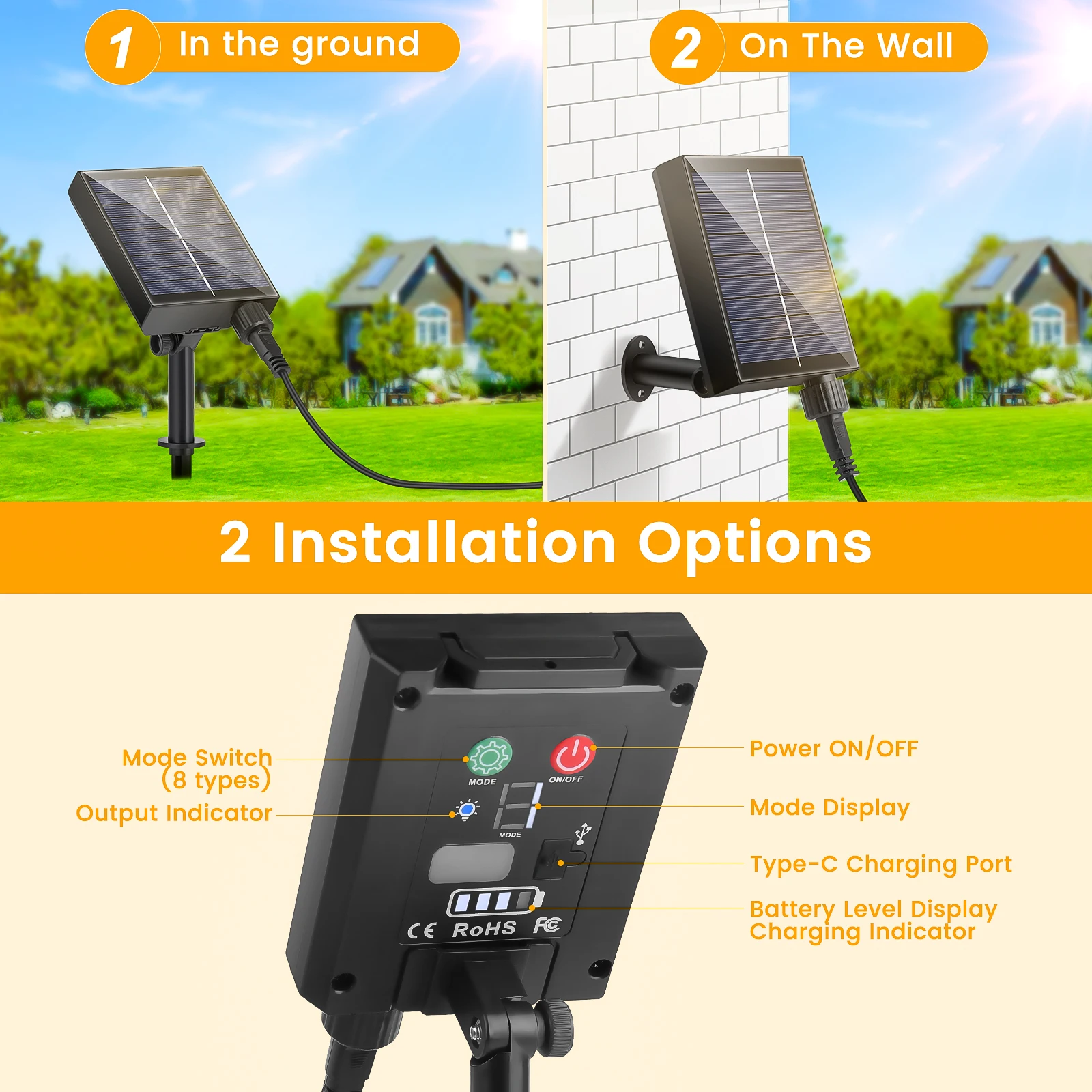 【Solar & USB Charging】These solar string lights can work up to 16 hours after full charging by sunlight. A 180 degree adjustable panel allows you to get the optimum sun exposure. The USB charge can be complementary when there is no sufficient sunlight during the day.