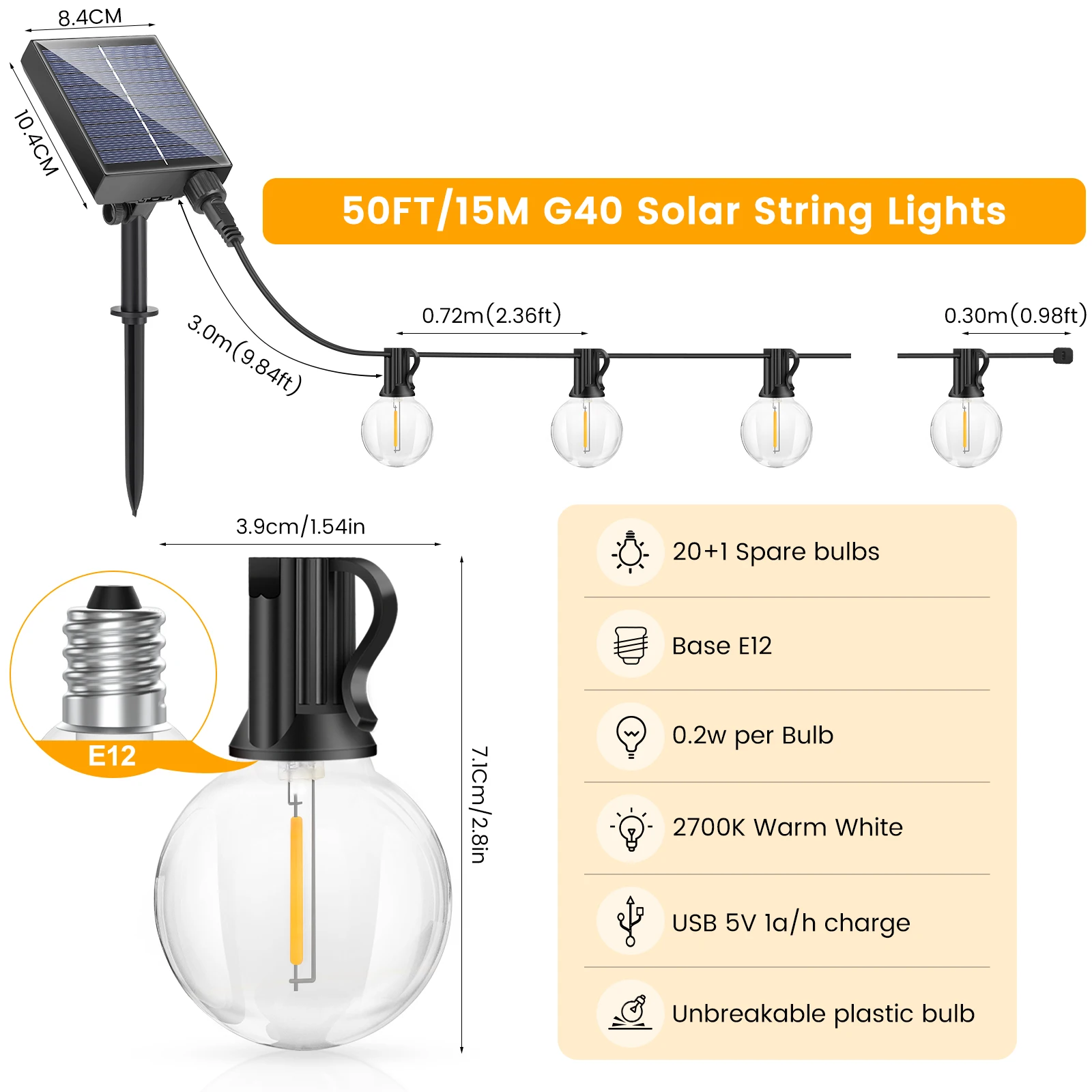 G40 Solar String Lights with Remote Control Outdoor 15M Patio Lights/21pcs LED Shatterproof Bulbs for Backyard Bistro Decoration