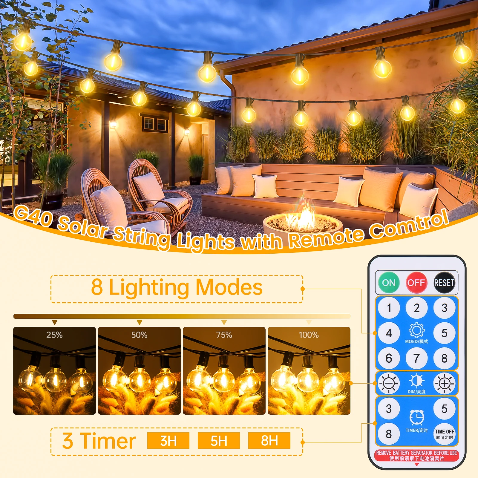 G40 Solar String Lights with Remote Control Outdoor 15M Patio Lights/21pcs LED Shatterproof Bulbs for Backyard Bistro Decoration