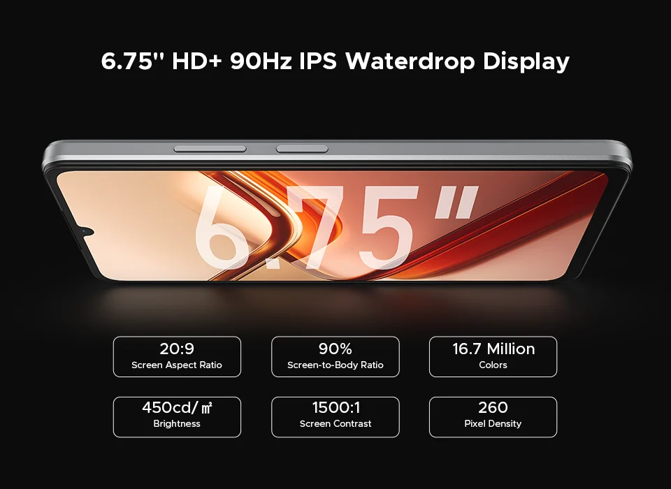 6.75″ HD+ 90Hz IPS Waterdrop Display