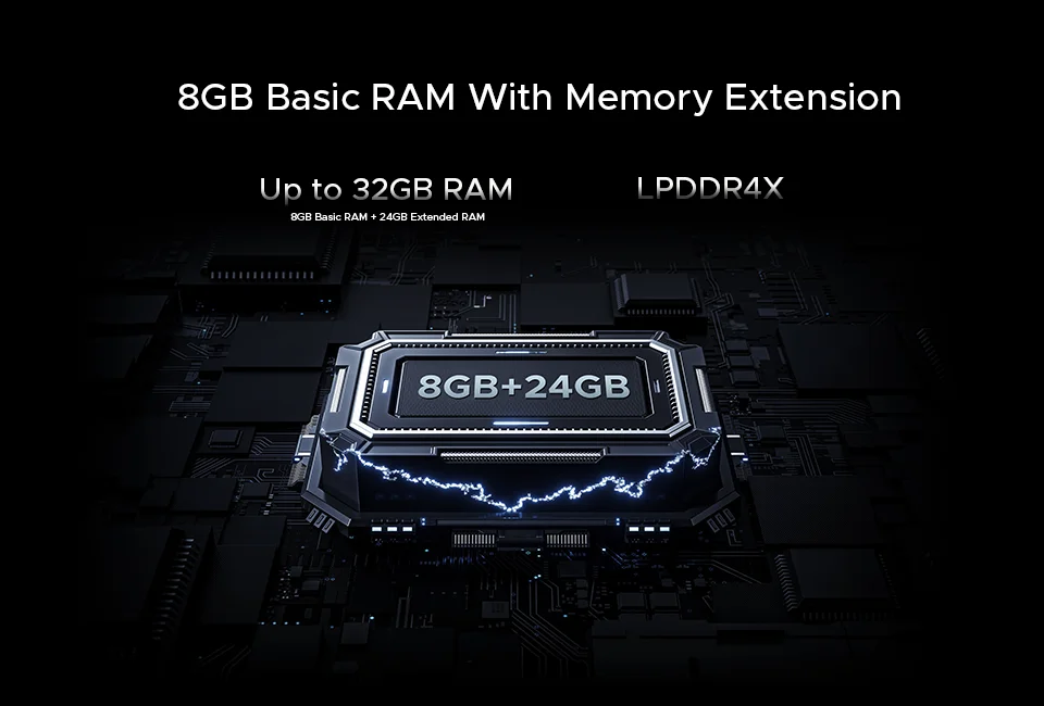 32GB RAM(8GB+Up to 24GB Extended RAM) / LPDDR4X+128GB ROM / uMCP |
