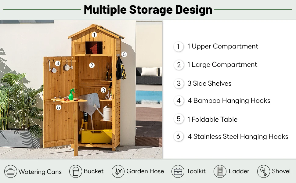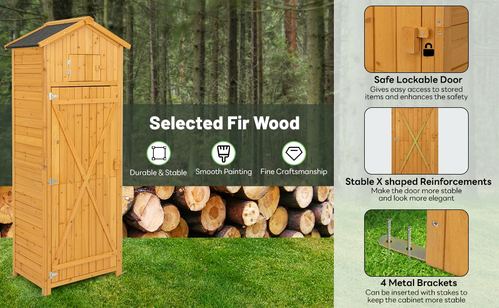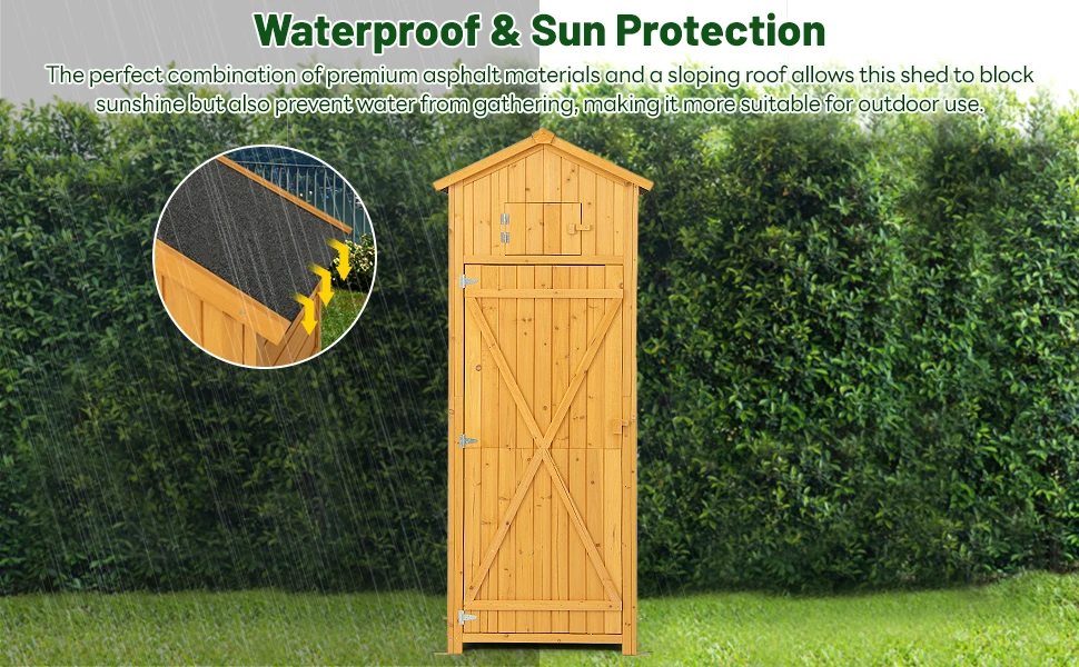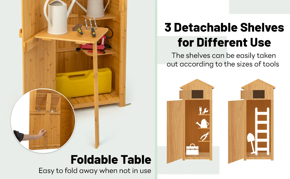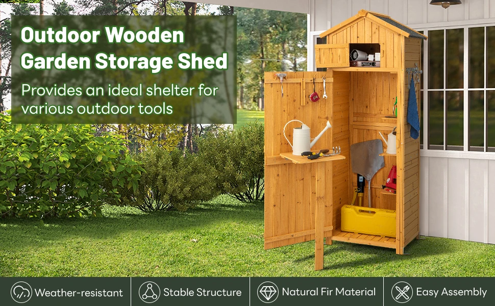Our outdoor garden tool cabinet measures 75 x 50 x 180.5 cm (L x W x H) and provides a large storage space to store and sort out various tools and equipment, such as shovels, rakes, gardening tools, watering cans, garden hoses, sports equipment, toolkit, and more. It comes with an upper compartment for storing small tools or personal belongings, 3 tiers of shelves Allowing you to store tools in an orderly manner, and a large interior space for storing long tools and gardening equipment. Moreover, it is set with a foldable table on the door, which is easy to fold and unfold according to your own needs. Besides, the tall wooden shed adopts a solid fir wood frame and an asphalt roof, which can effectively resist bad weather and be used outdoors for a long time. This outdoor wood tall shed is suitable for placing in the garden, terrace, deck, porch, garage, etc.