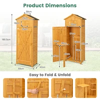 Our outdoor garden tool cabinet measures 75 x 50 x 180.5 cm (L x W x H) and provides a large storage space to store and sort out various tools and equipment, such as shovels, rakes, gardening tools, watering cans, garden hoses, sports equipment, toolkit, and more. It comes with an upper compartment for storing small tools or personal belongings, 3 tiers of shelves Allowing you to store tools in an orderly manner, and a large interior space for storing long tools and gardening equipment. Moreover, it is set with a foldable table on the door, which is easy to fold and unfold according to your own needs. Besides, the tall wooden shed adopts a solid fir wood frame and an asphalt roof, which can effectively resist bad weather and be used outdoors for a long time. This outdoor wood tall shed is suitable for placing in the garden, terrace, deck, porch, garage, etc.