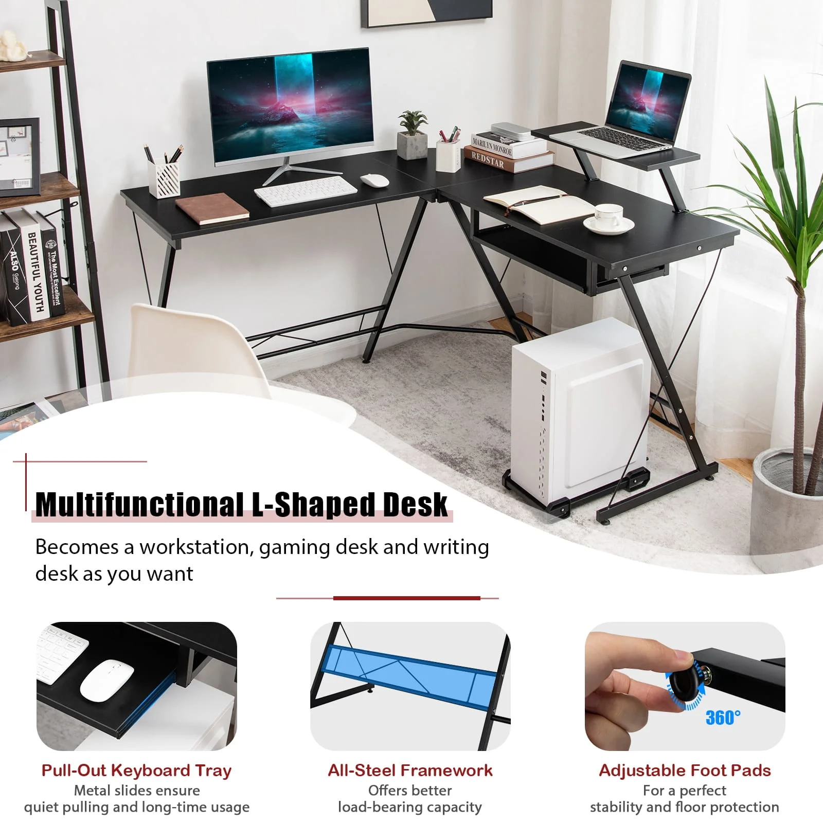 L-shaped workstation can fit the corner perfectly to make full use of your limited space. In this way, you can have sufficient office space even in a small room. Plus, in order to maximize the working space, the gaming desk features diverse practical parts. The tabletop is designed to be fairly spacious for a free workplace as well as adequate storage space for computers. There is a removable monitor shelf with an ergonomic height which can be installed on both sides. And a pull-out tray with metal slides accommodates your keyboard. At bottom, a movable host stand is also provided. Finally, the rustproof steel frame is able to support the whole desk stably and offers a strong weight capacity. At the same time, adjustable foot pads also improve overall stability.