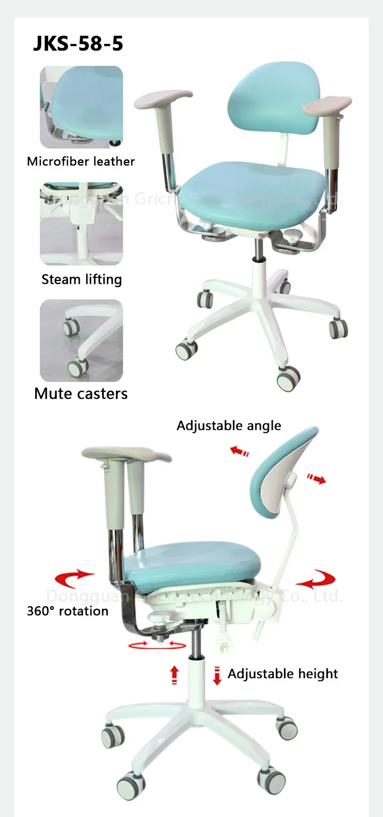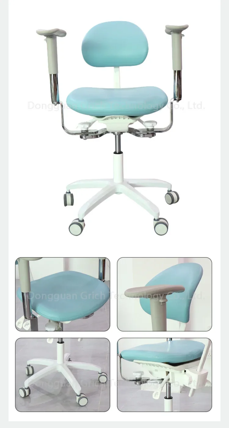 Features ● Pneumatic height adjustment – standard 49-62cm ● 360° swivel ● Movable double handrails ● Saddle seat cushion ● Anti-microbial vinyl covering ● PU mute wheel