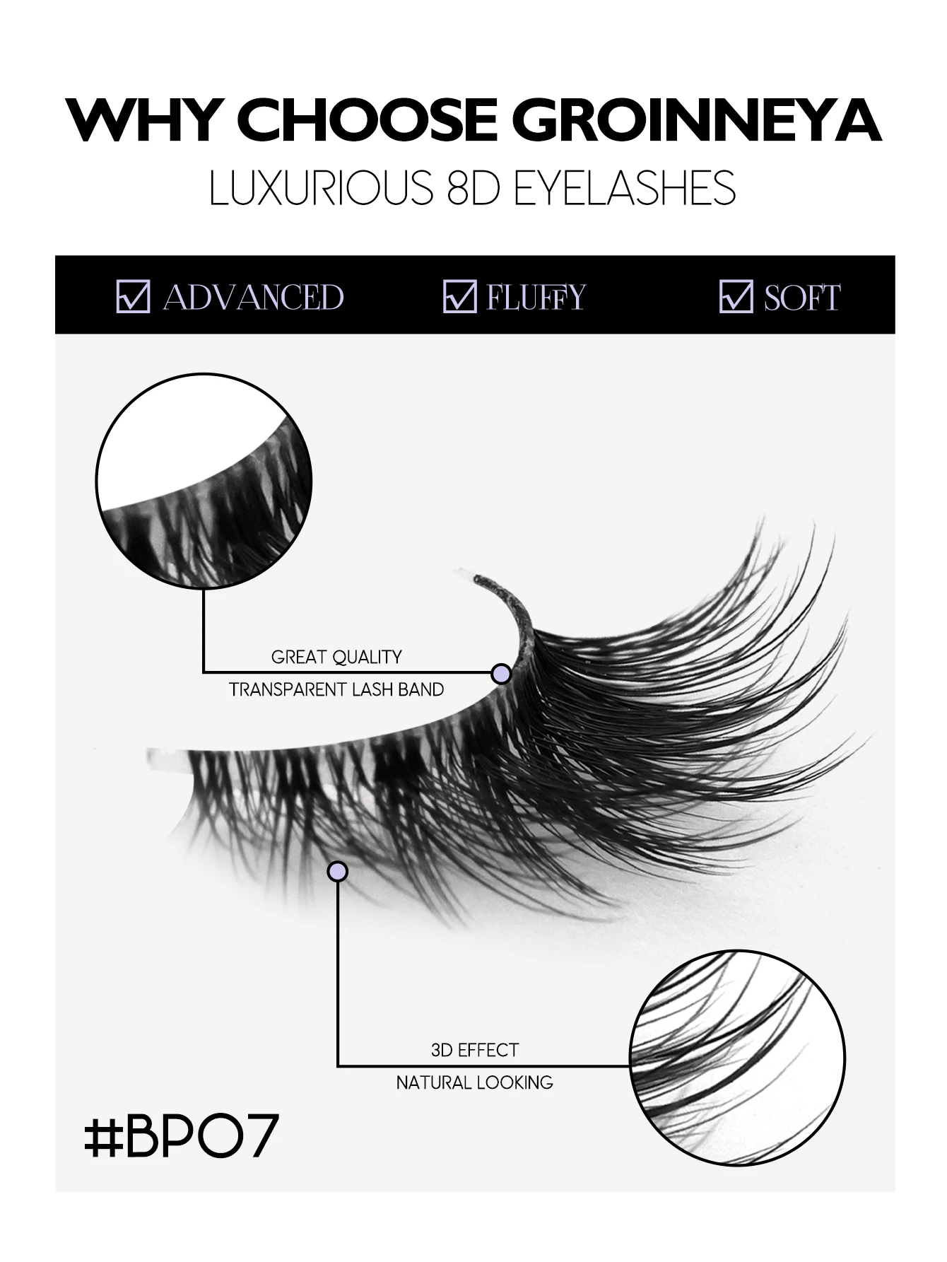 GROINNEYA false eyelashes are made of premium synthetic fibers, 100% handmade, lightweight as feather, zero burden to your eyes