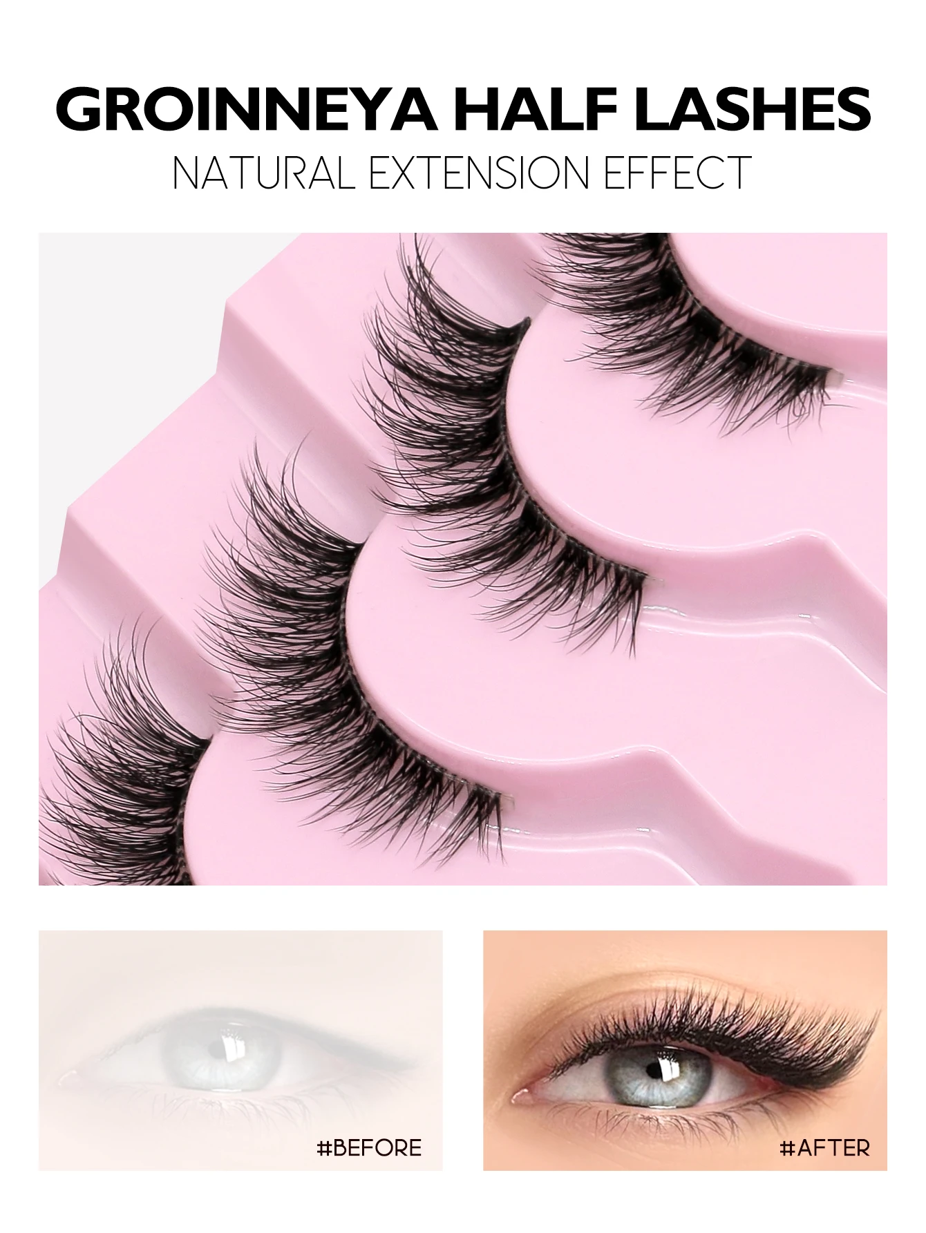 GROINNEYA half lashes is different from ordinary false lashes, the half strips can be stacked to the outer corner of your eyes, your real lashes still in the inner corner of eyes, looks like more real and fantastic.