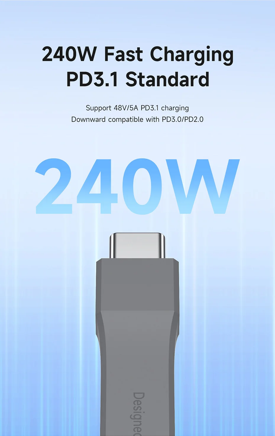 PD High-Speed Charging: Built-in E-marker chip, PD 3.1 standard supports 240W fast charging, while it is backward compatible with PD3.0 and 2.0 protocols,Supports high power output of up to 48V5A.