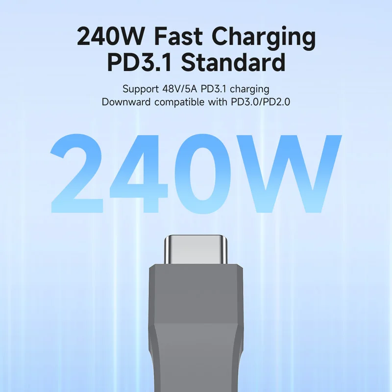 PD High-Speed Charging: Built-in E-marker chip, PD 3.1 standard supports 240W fast charging, while it is backward compatible with PD3.0 and 2.0 protocols,Supports high power output of up to 48V5A.