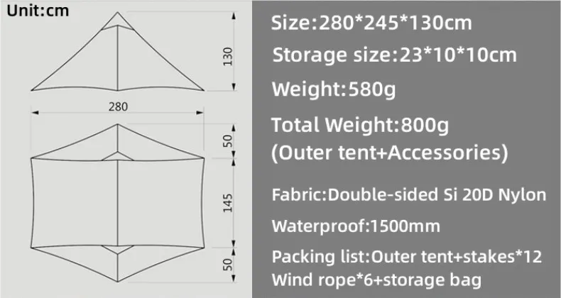 Packing list: Outer tent+Stakes*12+Wind rope*6+Storage bag
