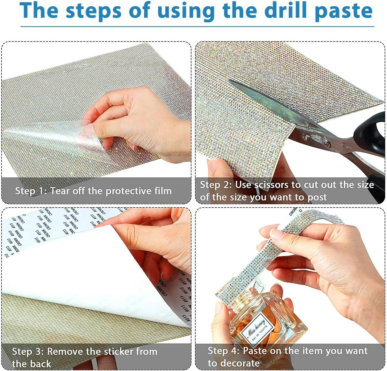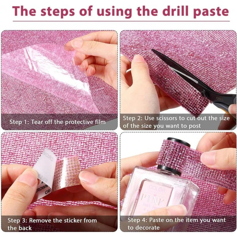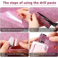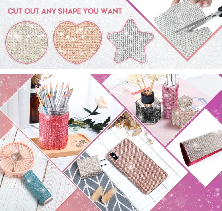 according to your needs can be cut out any shape you want, cut the appropriate size, remove the bling gem rhinestone sticker from the back, place it on the smooth surface you want to decorate, and press ( don't go near the water for 48 hours after pasting), convenient for your hand-made crafts
