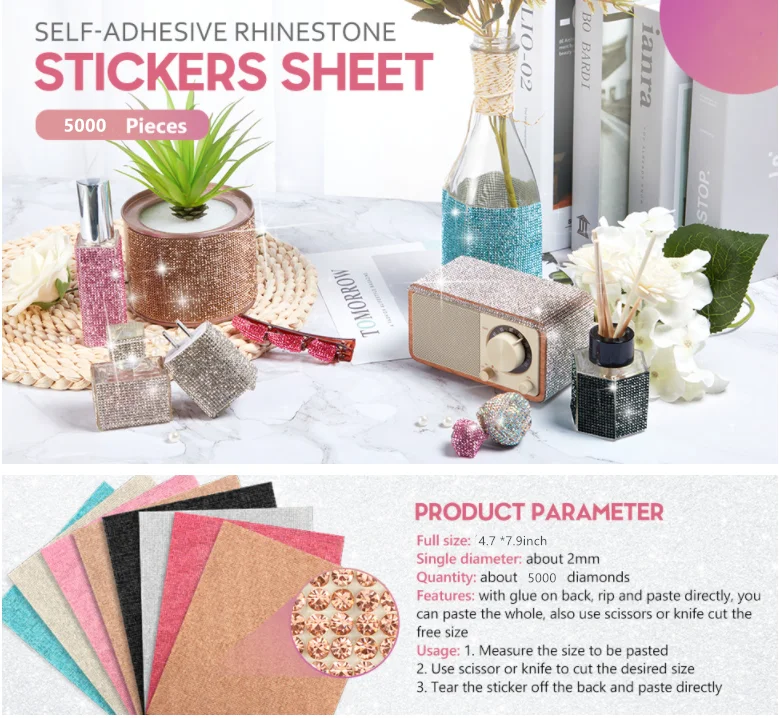 each rhinestone is about 2 mm in size and looks very shiny; In fact, you can buy 5000 (or more) bling rhinestone diamonds on a sheet of paper, the bling rhinestone will add a touch of glamour to your work