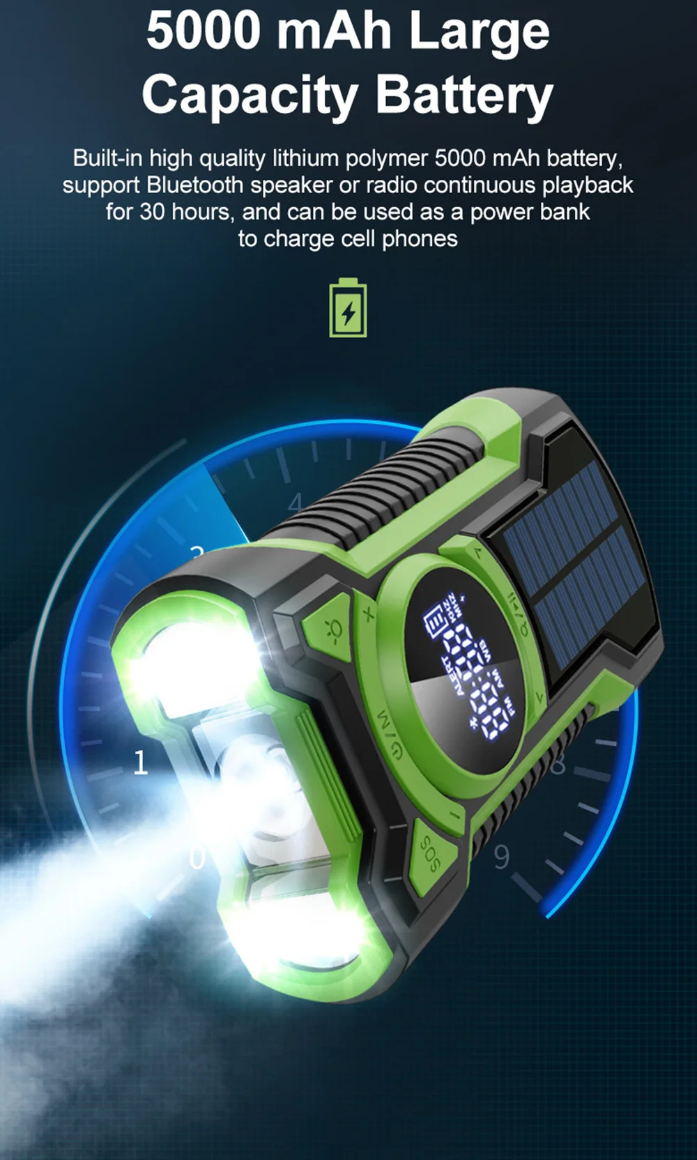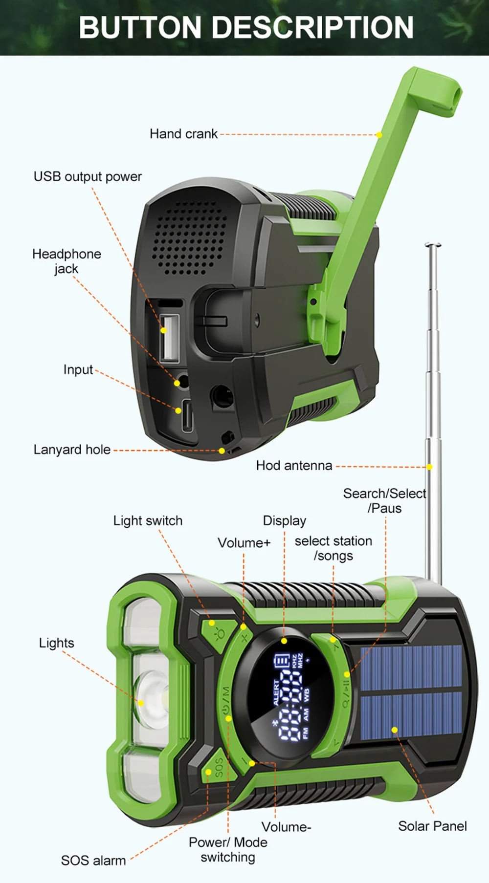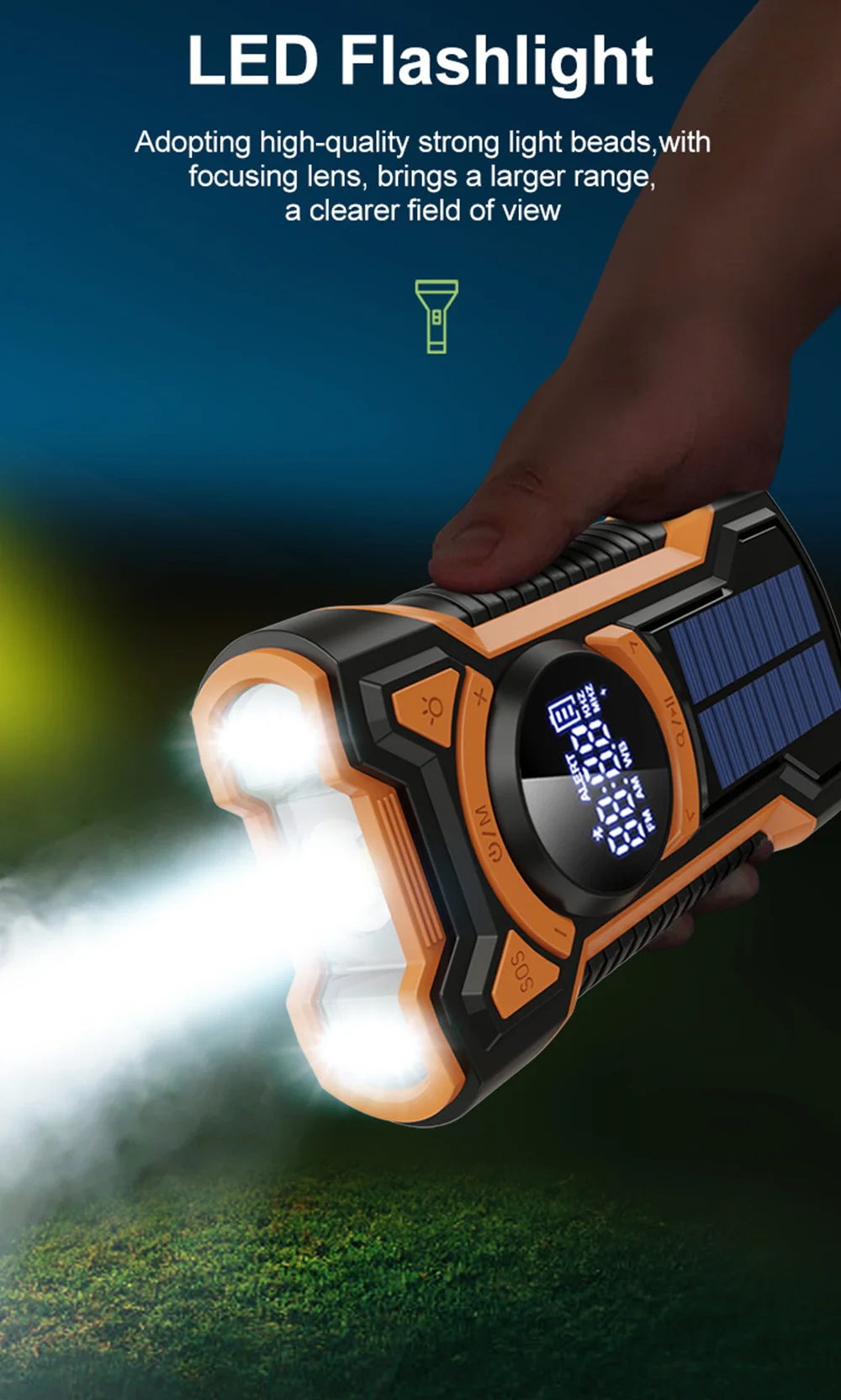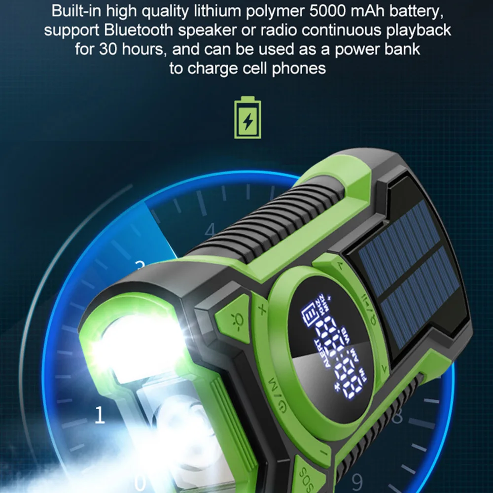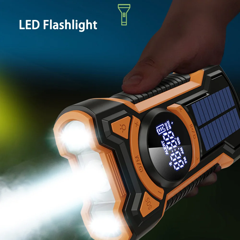 4. With Flashlight: Radio has multi-function, not only can send out distress signals, receive information, but also with a flashlight, when necessary, the flashlight mode can be turned on to illuminate the night. Can be charged by solar and hand crank.