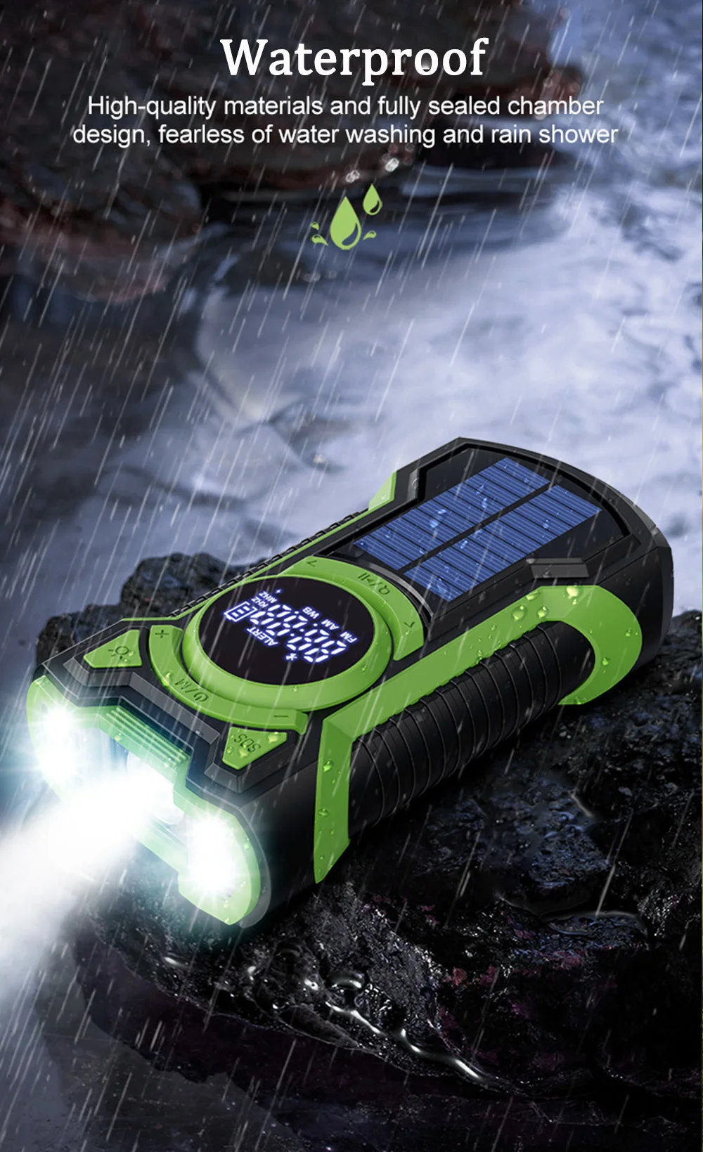 3.This radio has a super loud alarm and flashing red light to attack attention in time and be rescued. Flashlight provides highlights continuously; more available. Waterproof essential suit for casual camping, backpacking, wild survival.