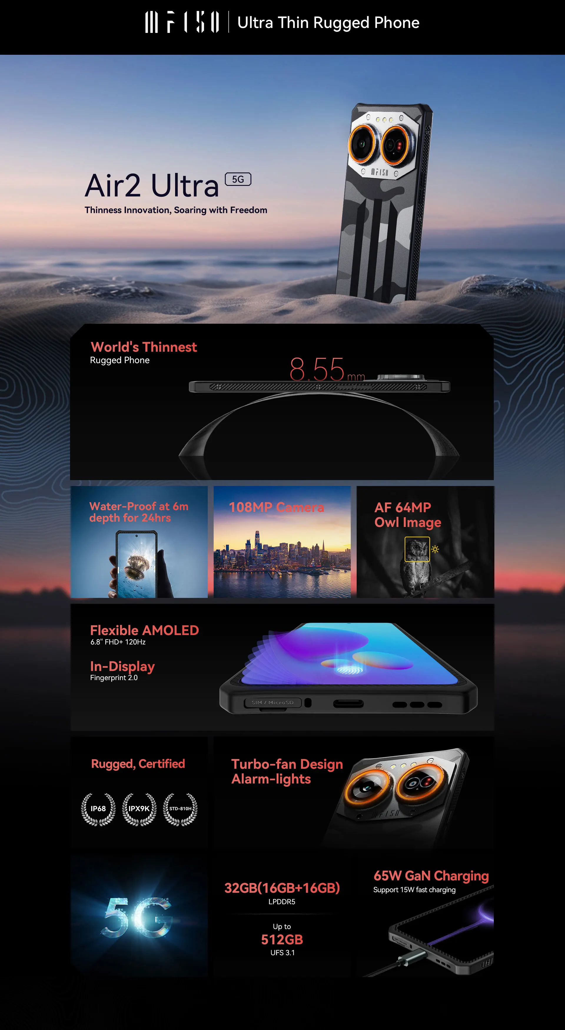 IIIF150 Air2 Ultra 16GB+512GB 5G Rugged Phone Ultra-thin 6.8”FHD+ 120Hz Flexible AMOLED Screen 108MP Camera 65W Fast Charge