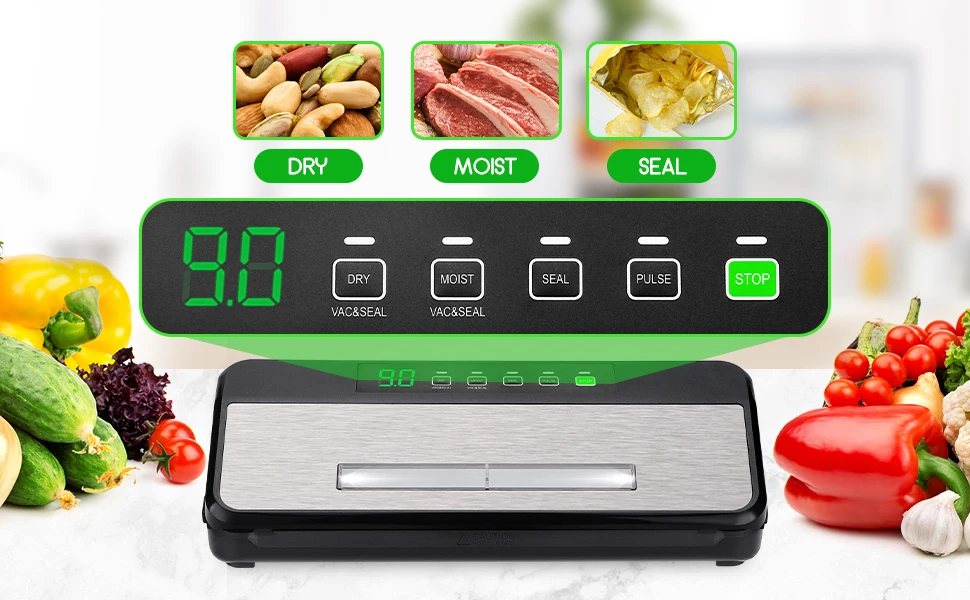 One-touch Operation:With only one touch, you can vacuum and seal to lock in the food's original flavor and keep it fresh longer than before. This IVS-011 supports five operating modes, Dry/Moist/Seal/Pulse/External Vac, and it only takes 17 seconds to complete the program in dry mode. Select any function, and the machine will prompt you with LED indicators when it starts and stops.
