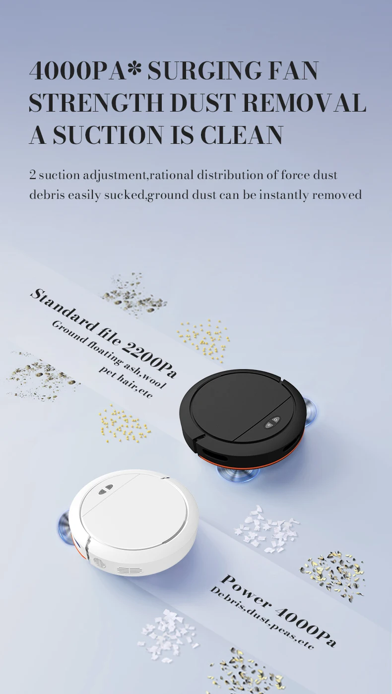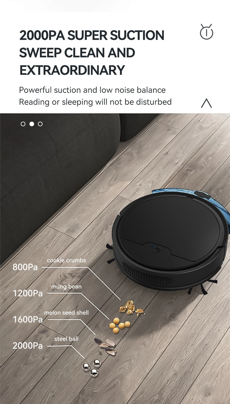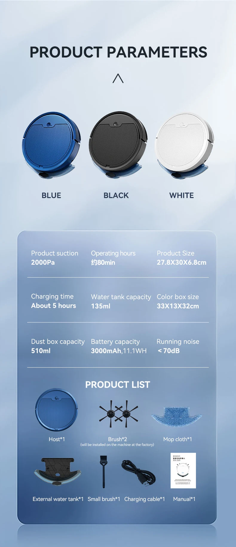 7.Suction: standard gear 500PA, medium gear 900PA, high gear 1800PA, strong gear 2700PA