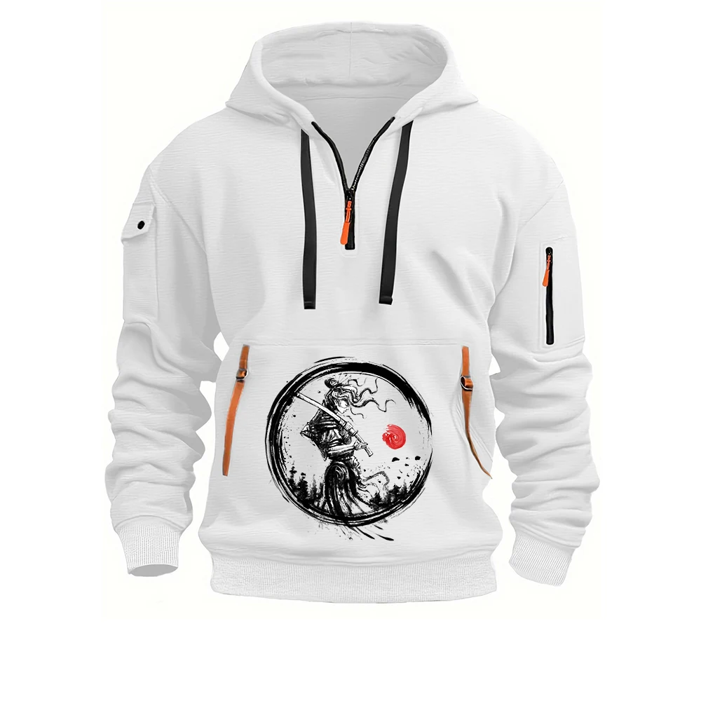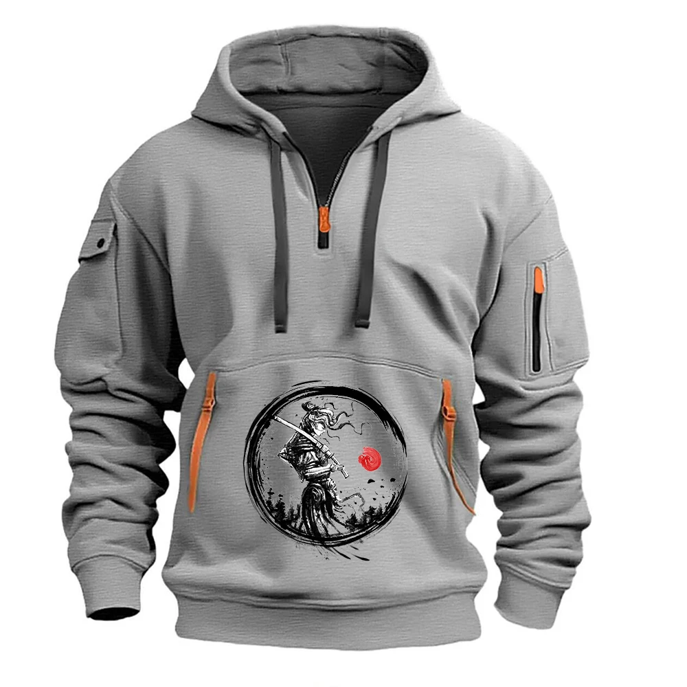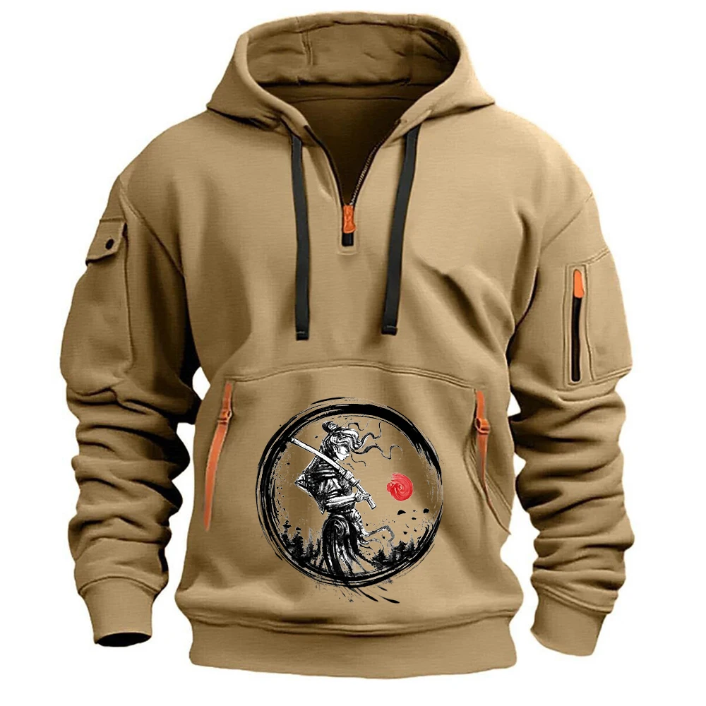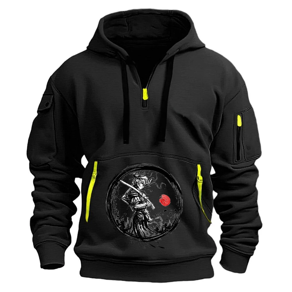 Japanese Samurai Graphic 2025 New Multi Pocket Zipper Fleece Hooded Casual Shirt Men Loose Pullover Fashion Sweatshirt Top