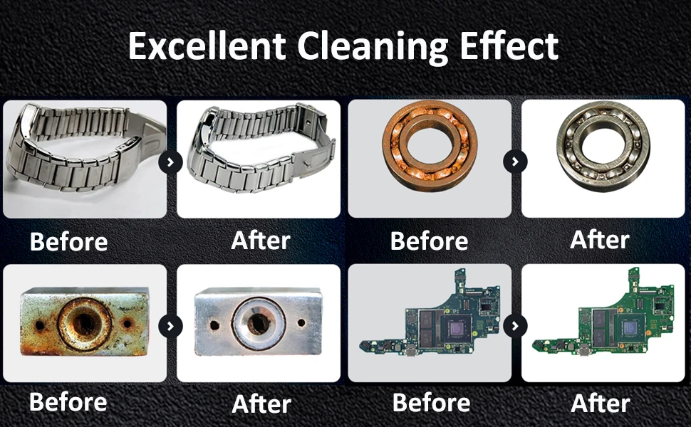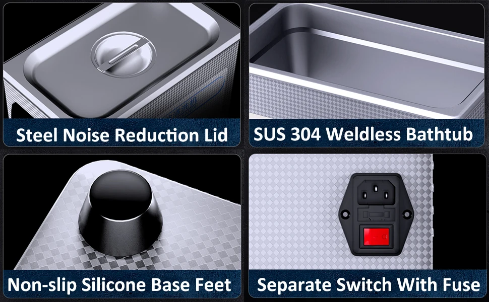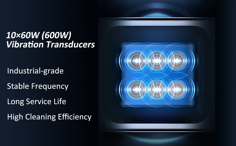 4. Ultra sonic cleaner does a fast, effective and pratical cleaning job. 600W (10pcs) ultrasonic transducer and 40kHz high frequency vibration can effectively penetrate tiny crevices and blind holes, thoroughly clean objects with complex construction or irregular shapes.