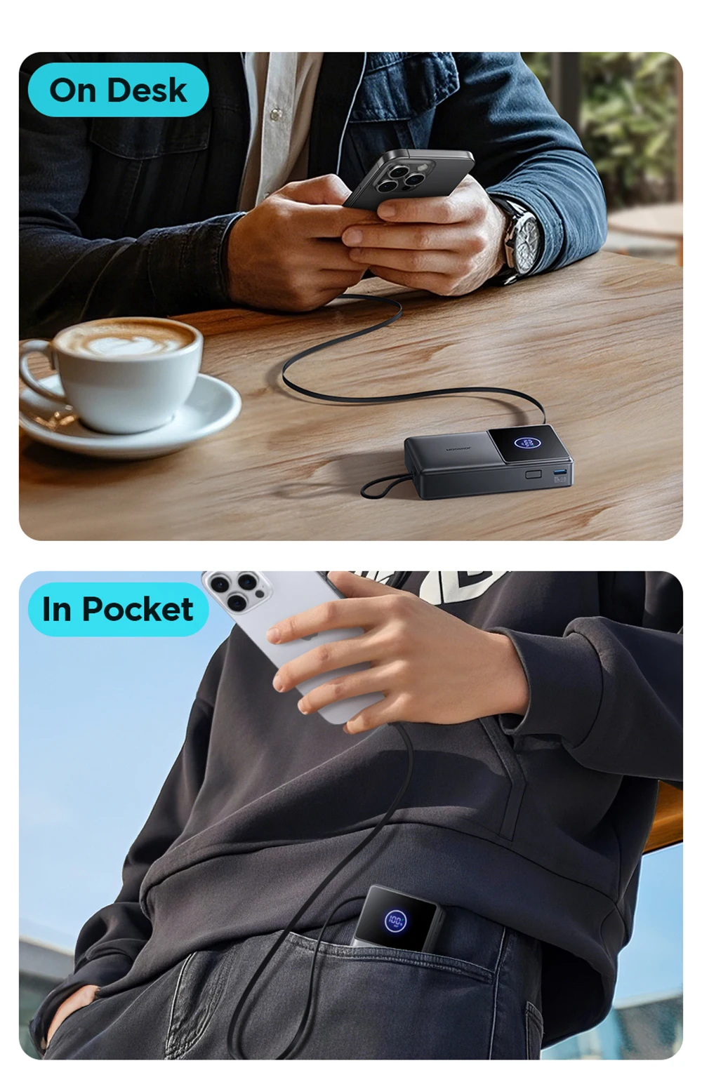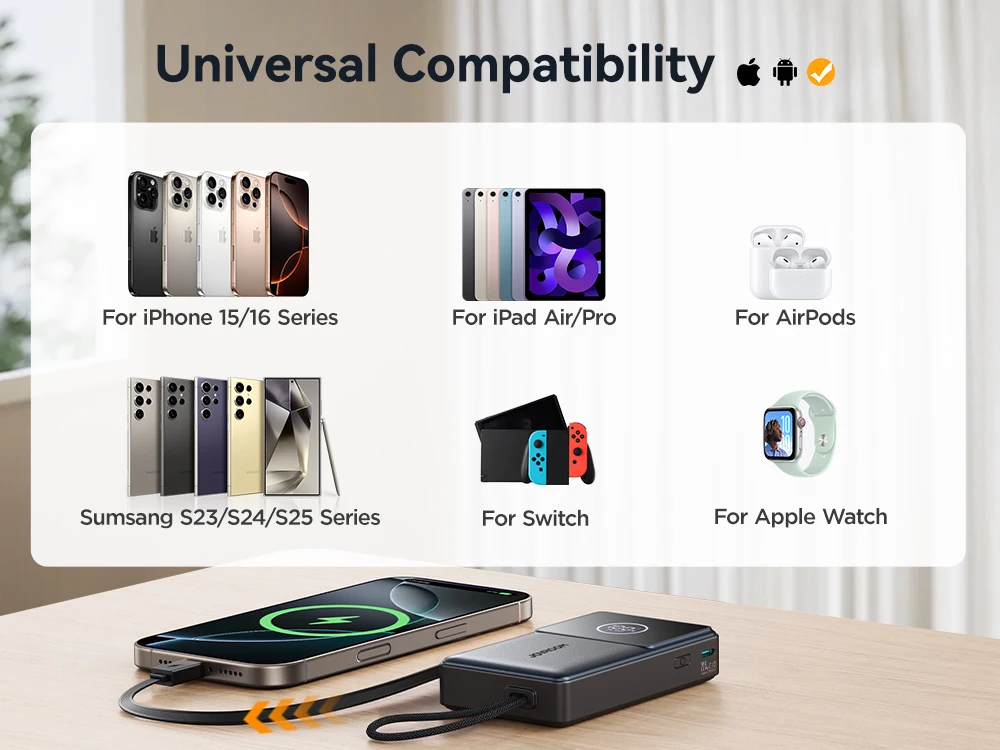 6.【10000 mAh capacity】Can charge For iPhone 16: 1.8 times / For Samsung S25: 1.6 times / For Xiaomi 15: 1.2 times