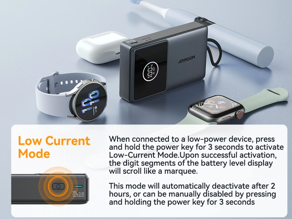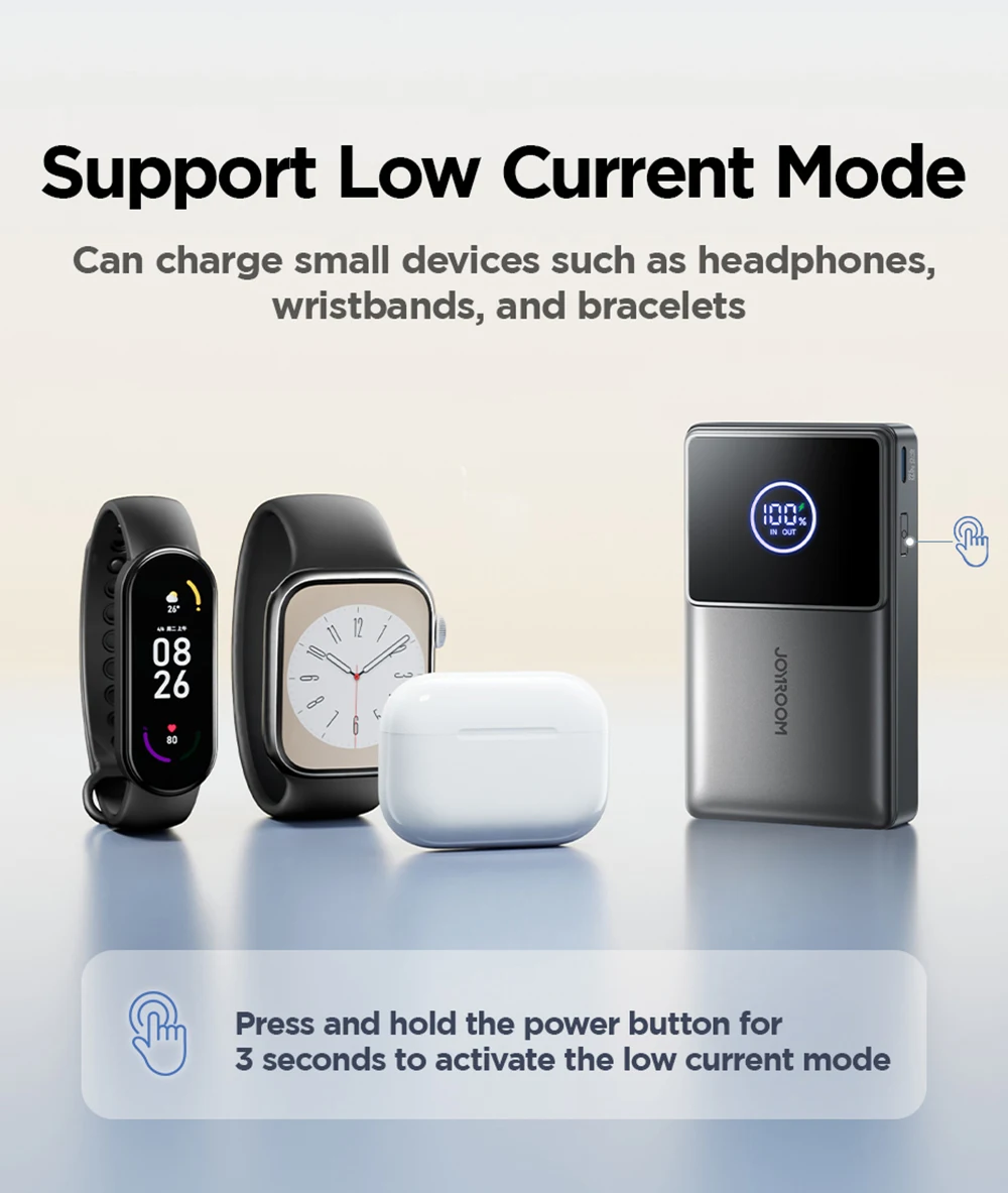 5.【Supports Low Current Mode】Press and hold for 3S to turn on, which can charge small devices such as headphones and watches