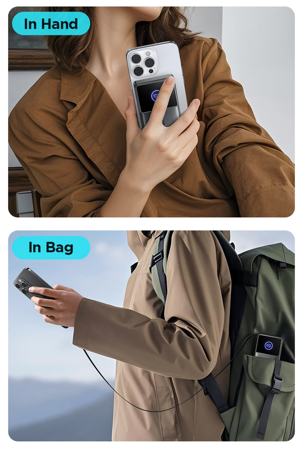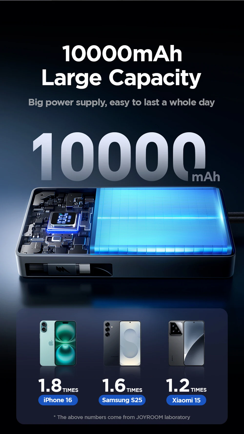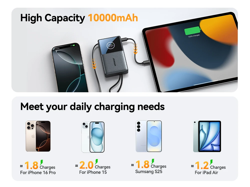 6.【10000 mAh capacity】Can charge For iPhone 16: 1.8 times / For Samsung S25: 1.6 times / For Xiaomi 15: 1.2 times