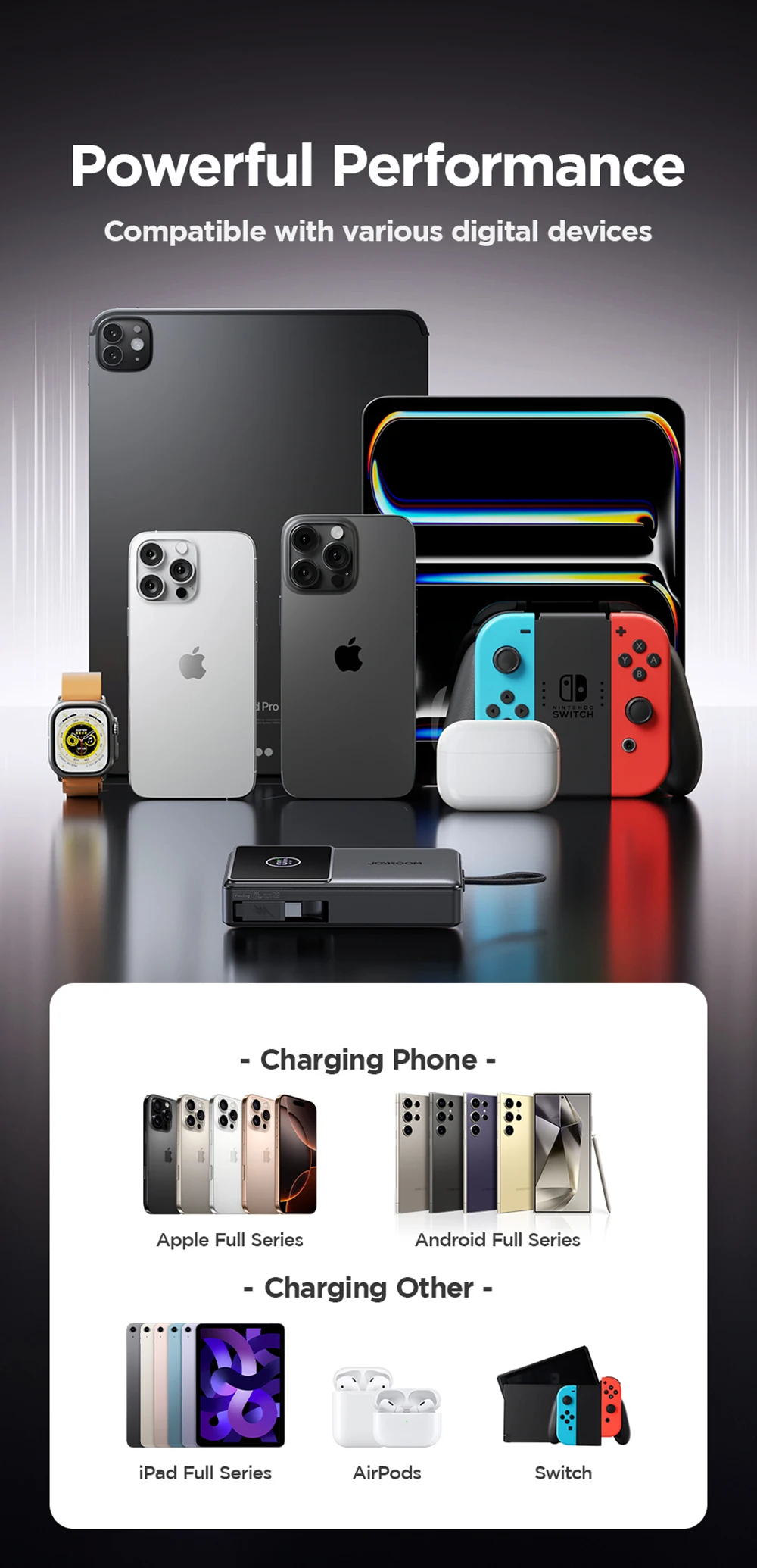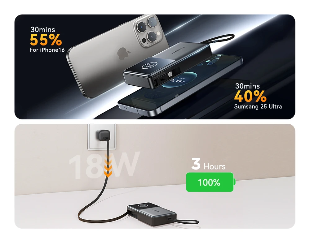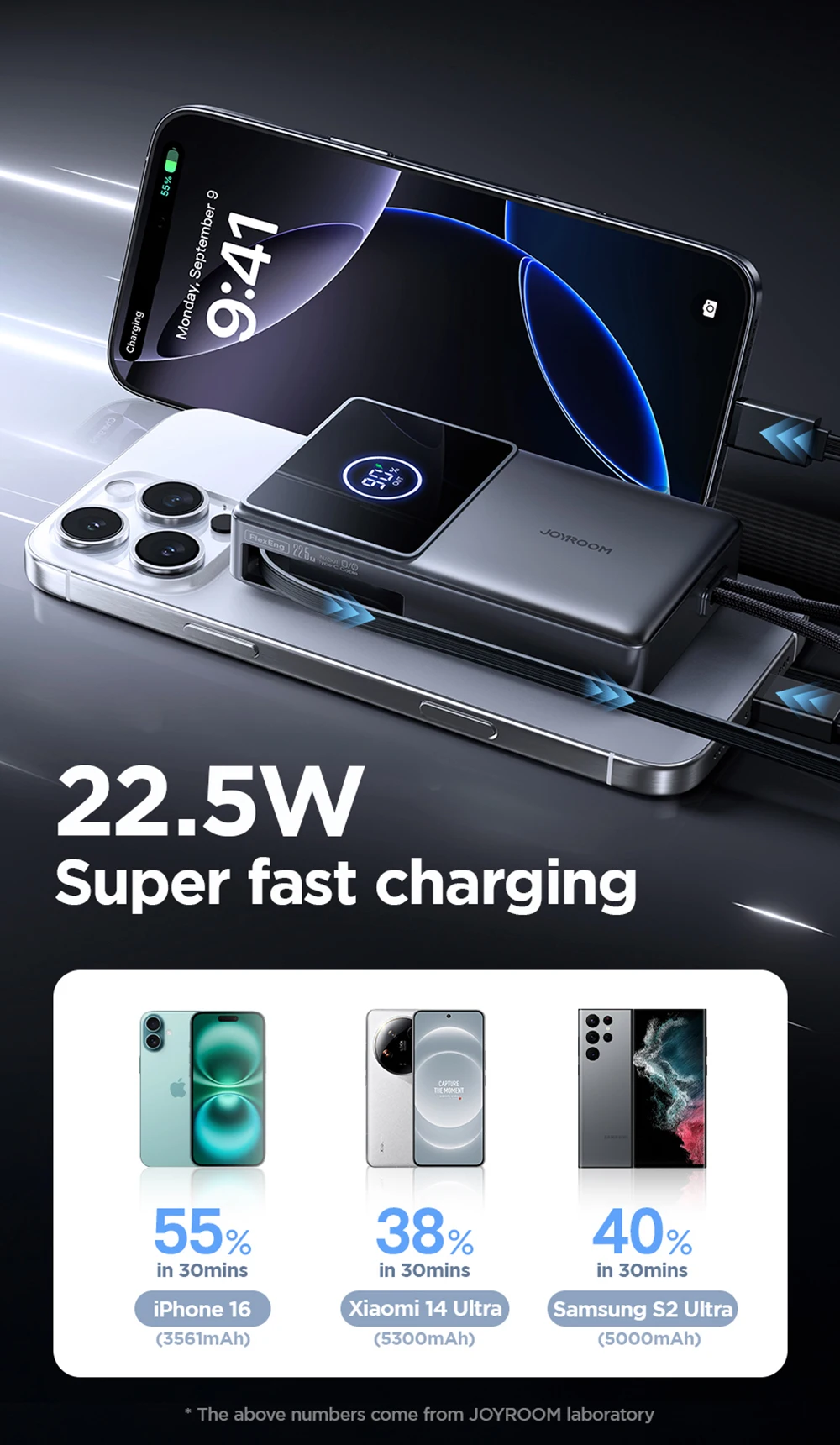 3.【22.5W Fast Charging】30 minutes to charge for iPhone16 (3561mAh) 55%,for Xiaomi14 Ultra (5300mAh) 38%,for Samsung S25 Ultra (5000mAh) 40%