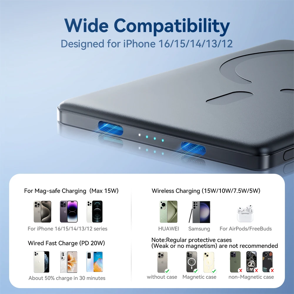 2.Charge in a Snap:Utilizing for Mag-Safe wireless charging technology, provides fast 7.5W charging for iPhone 16/15/14/13/12 series. Equipped with USB-C PD 20W for anxiety-free rapid charging.