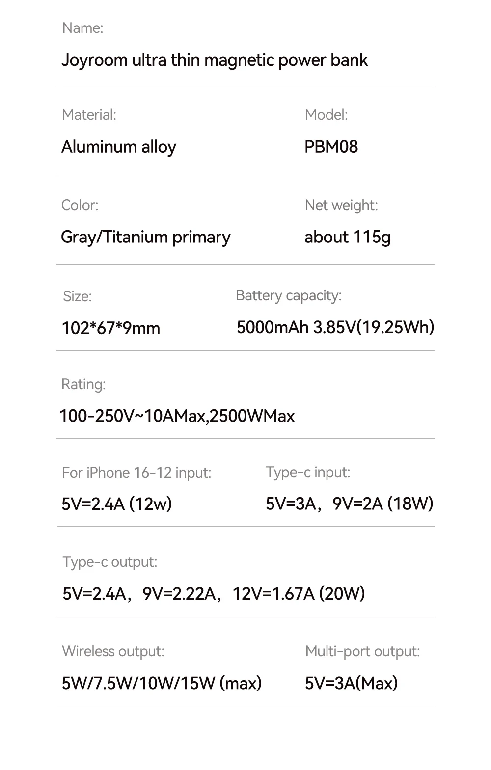 Type-c Output:5V=2.4A,9V=2.22A,12V=1.67A(20W)