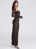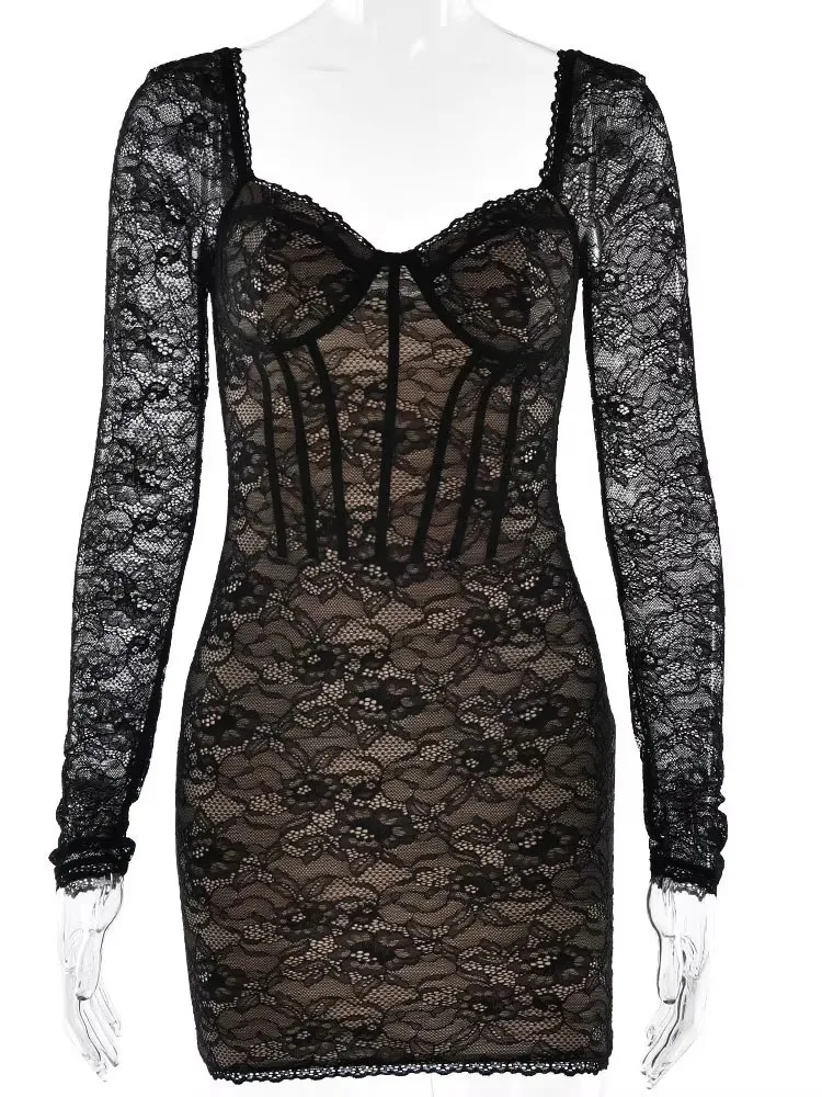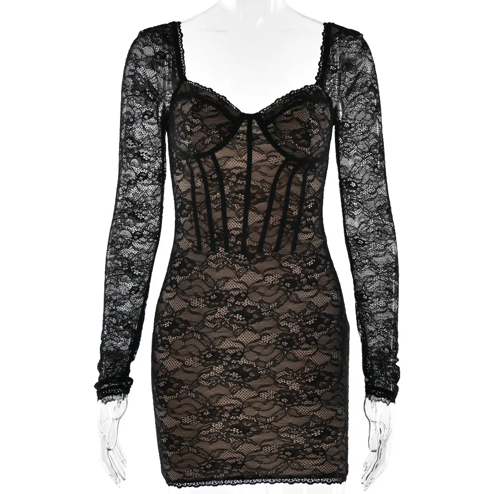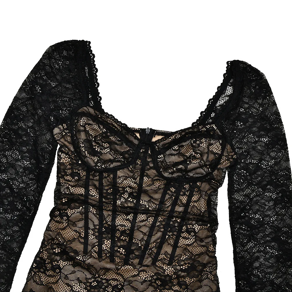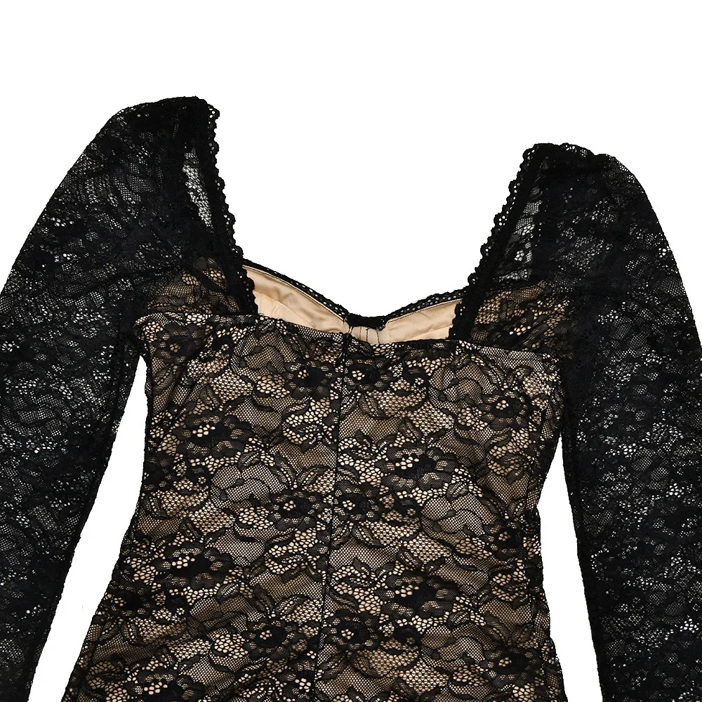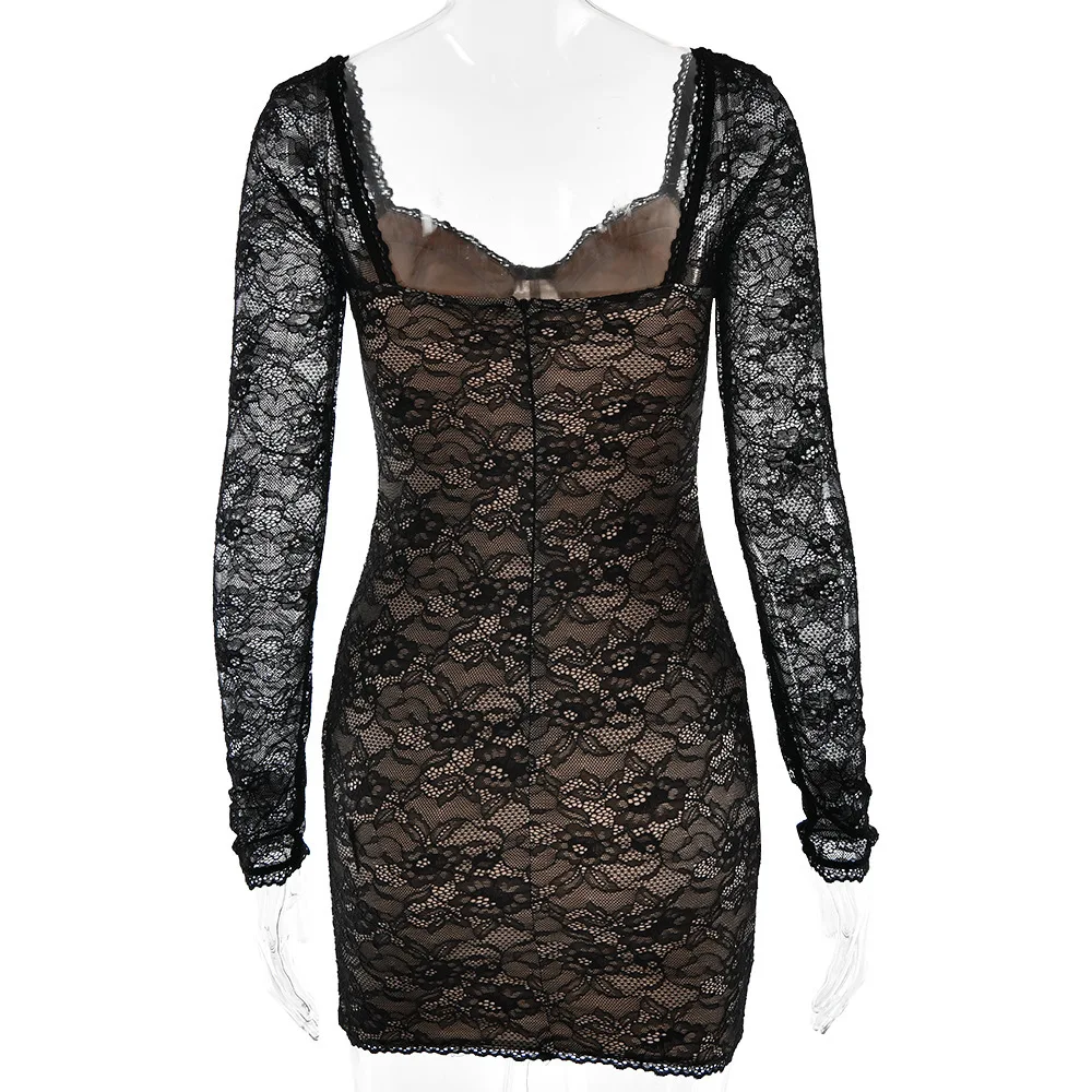 JULISSA MO Autumn New Long Sleeve Stretch Lace Women Dress Black Low Chest Print Floral Skinny Elegant Party Evening Dress 2025