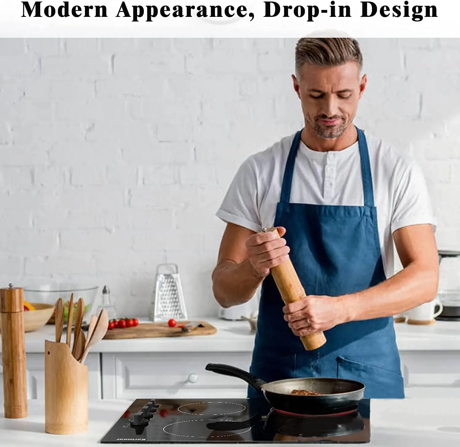【24" Electric Cooktop with Knob Control 】No complicated buttons, easy to operate and use. It is very suitable for the elderly, suitable for people with poor eyesight, not only is it easy to use, but the feeling of rotating the button by hand is more reliable. With electronic knob, the electric stove top 4 burner can prevent children or family pets, cats from accidentally touching the switch button, which is safer than touch screen button.