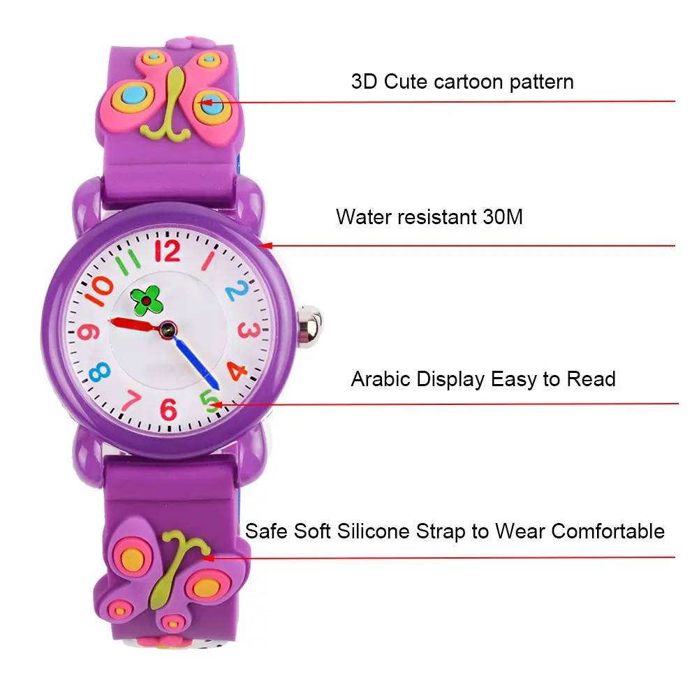 Kids Watch use top quality Japanese Quartz Movement to provide accuracy time. And the funny cartoon style watches with its cute styled character with 3D cartoon design. Besides, the Comfortable Silicone Strap with Healthy Environmental material will not hurt kid’s Skin. Particularly it is daily waterproof and shock resistant. So you don’t need to worry about it will be damaged when kids are playing.