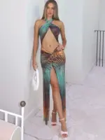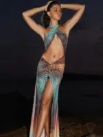 Be the first to review “kliou Panelled Halter Cross Women Maxi Dress Sexy Mesh Thin Hollow Pleated Split Sleeveless Sheath Robe Mujer Trend Party Frock”