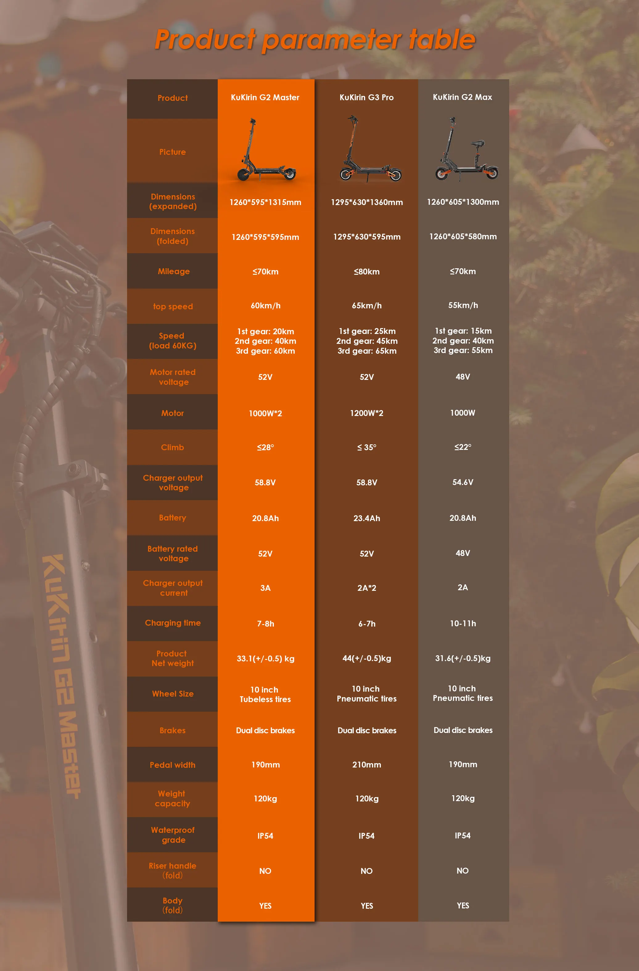 KuKirin G2 Master electric scooter equipped with 52V/1081.6KW.H high performance battery optimised for long range.A single charge can support a driving distance of up to 70Km,making long trips more convenient.