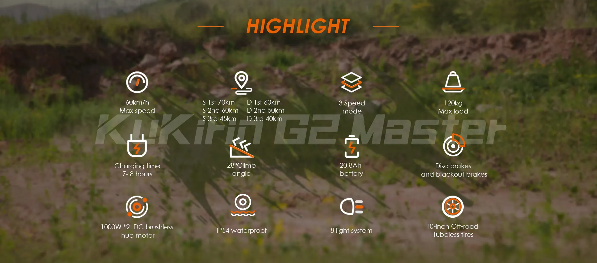 KuKirin G2 Master electric scooter equipped with 52V/1081.6KW.H high performance battery optimised for long range.A single charge can support a driving distance of up to 70Km,making long trips more convenient.
