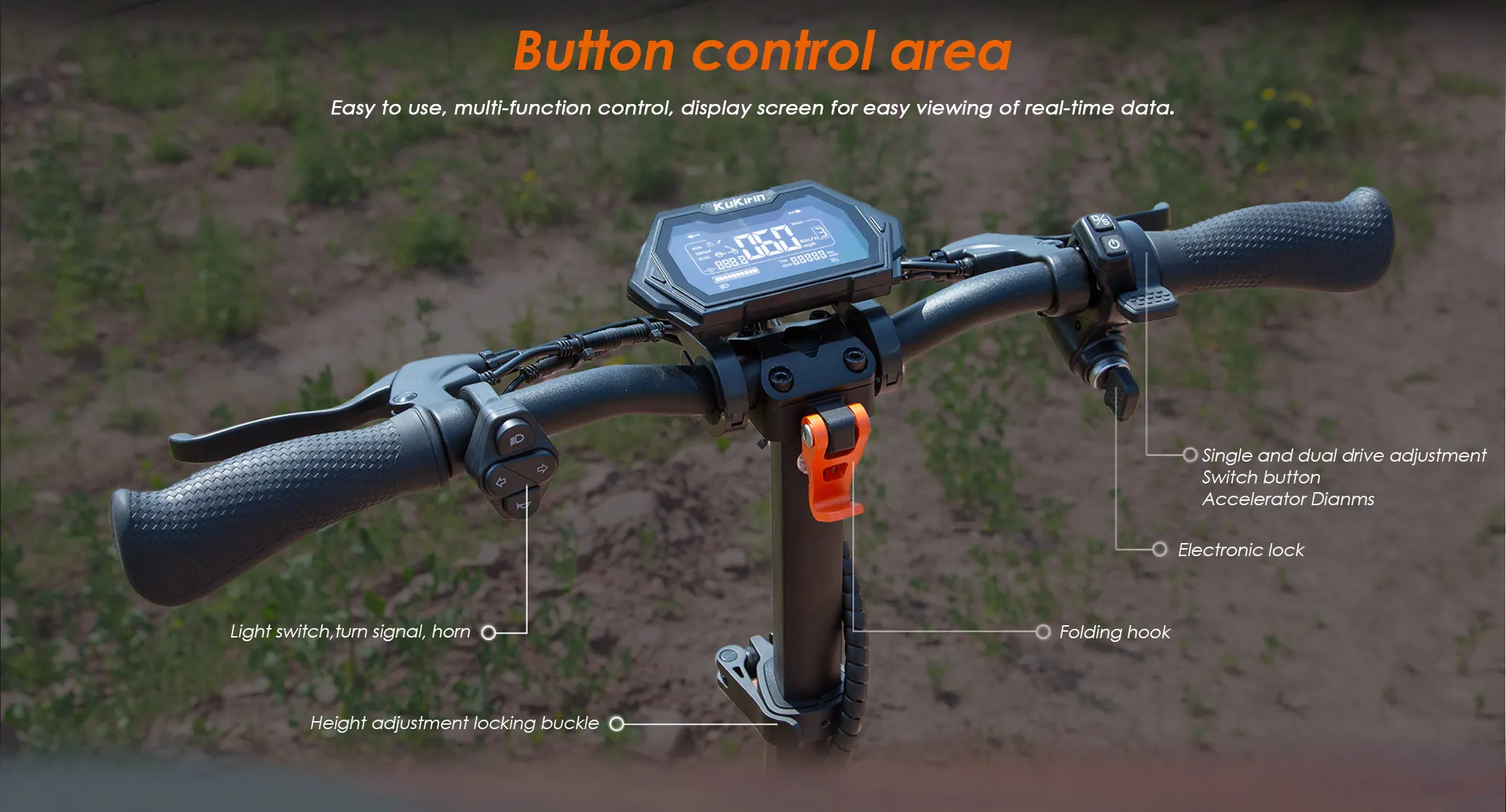 KuKirin G2 Master’s ultra-large display with high definition provides a more detailed image and text display,allowing the driver to view various scooter information and opeartion interface more clear.Driver can control the driving speed and direction on electric scooter through simple operation,which is easy to opearte and fun to drive,providing a better driving experience for customer.
