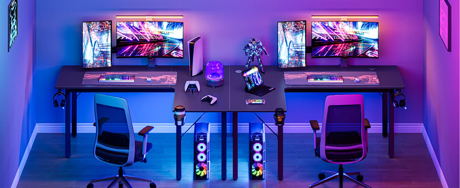 【PERFECT CONFIGURATION】 The L shaped corner gaming table is equipped with a practical cup holder, a headset hook, a game controller holder and an large mouse pad for keyboard and mouse. There are two power outlets on the desktop so you can better manage cables, eliminate confusion, and focus on the game in a good environment.