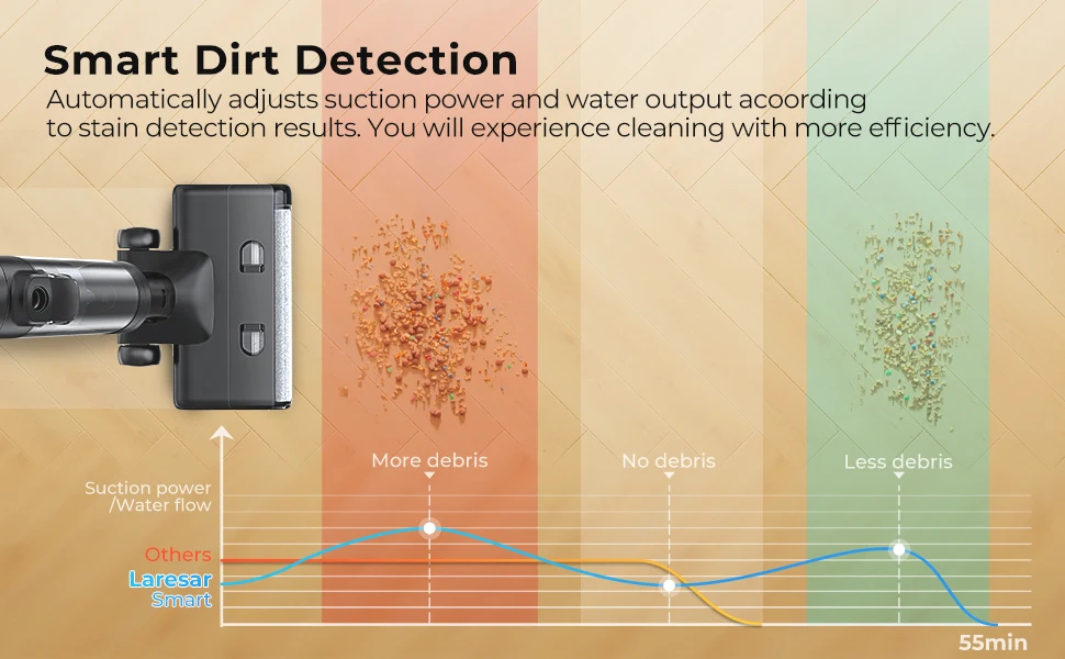 More debris / No debris / Less debris / Suction power/ Water flow / Others / Laresar Smart / 55min