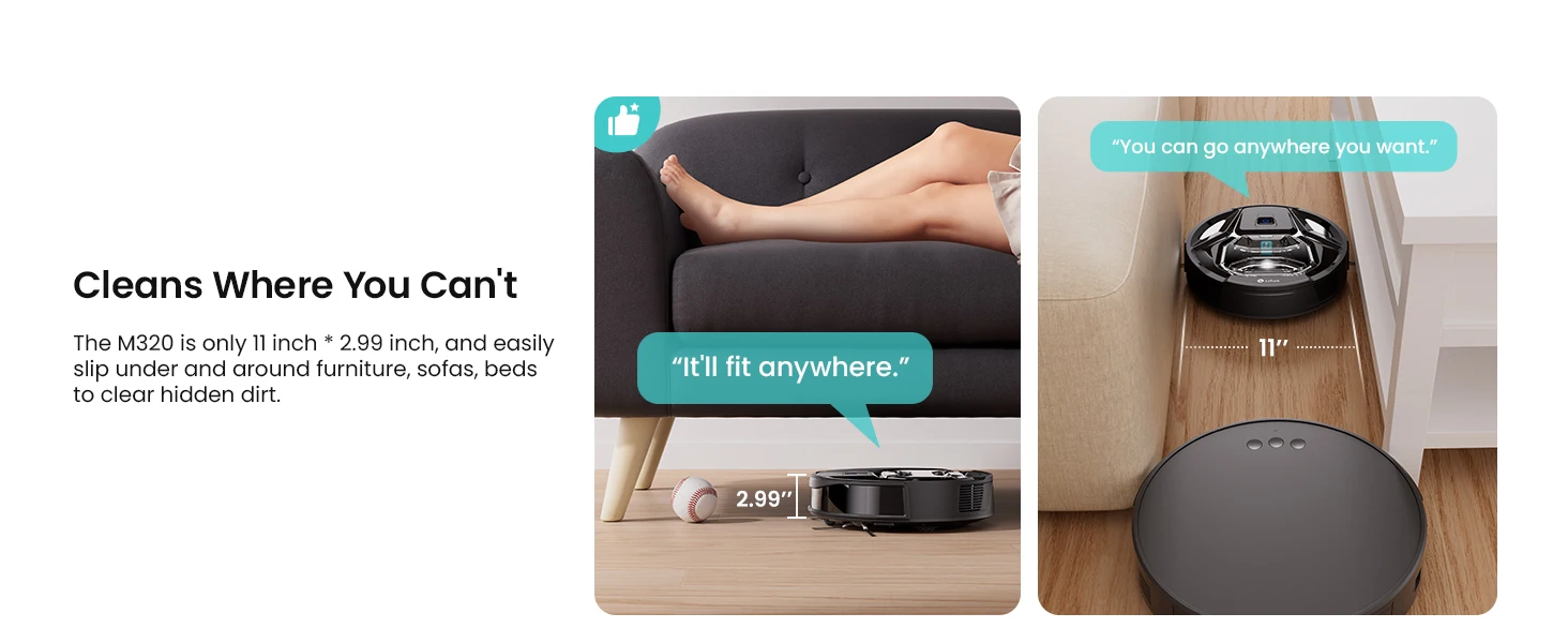 The M320 is only 1l inch* 2.99 inch, and easilyslip under and around furniture, sofas, bedsto clear hidden dirt.