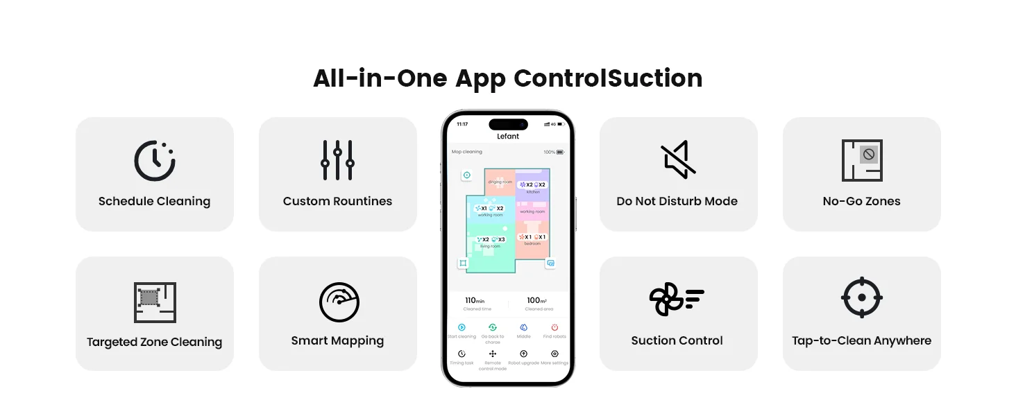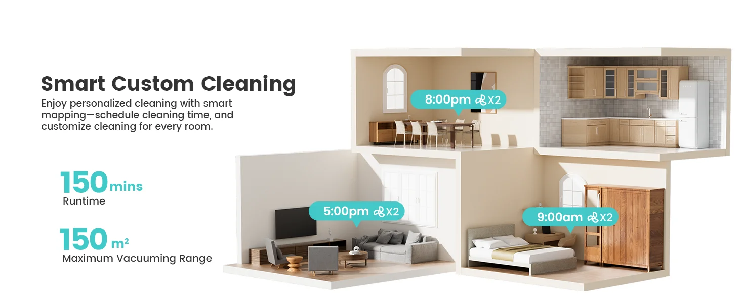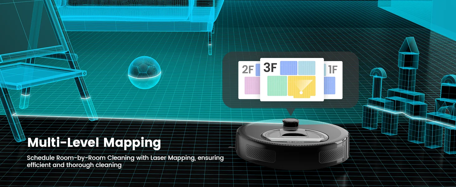 Schedule Room-by-Room Cleaning with Laser Mapping, ensuring efficient and thorough cleaning
