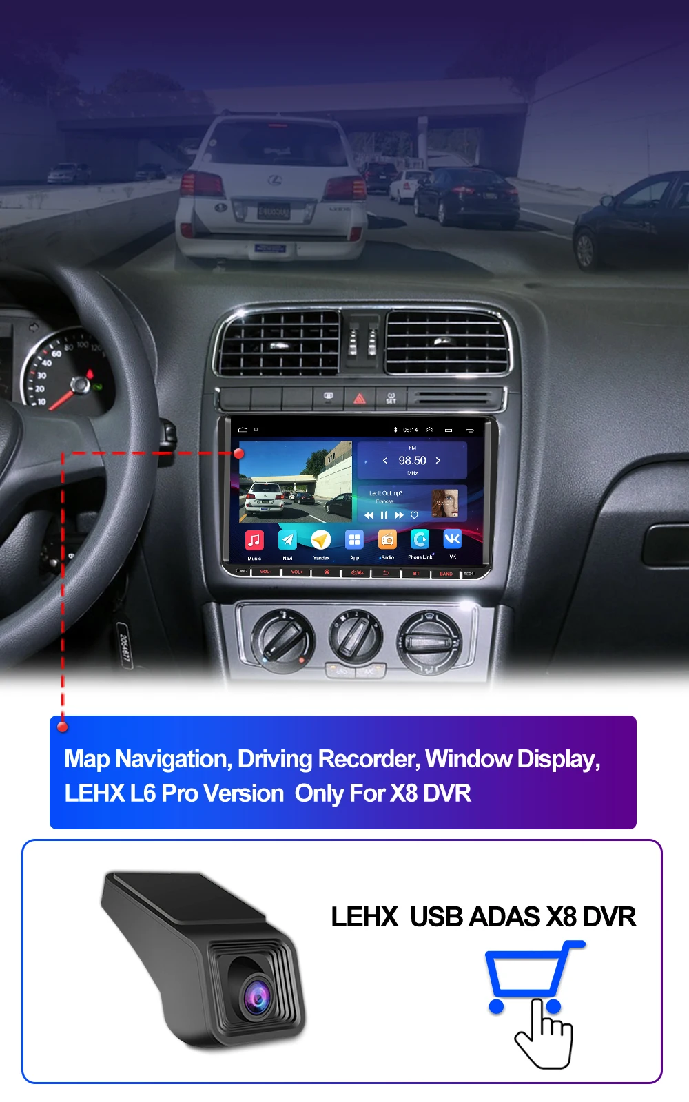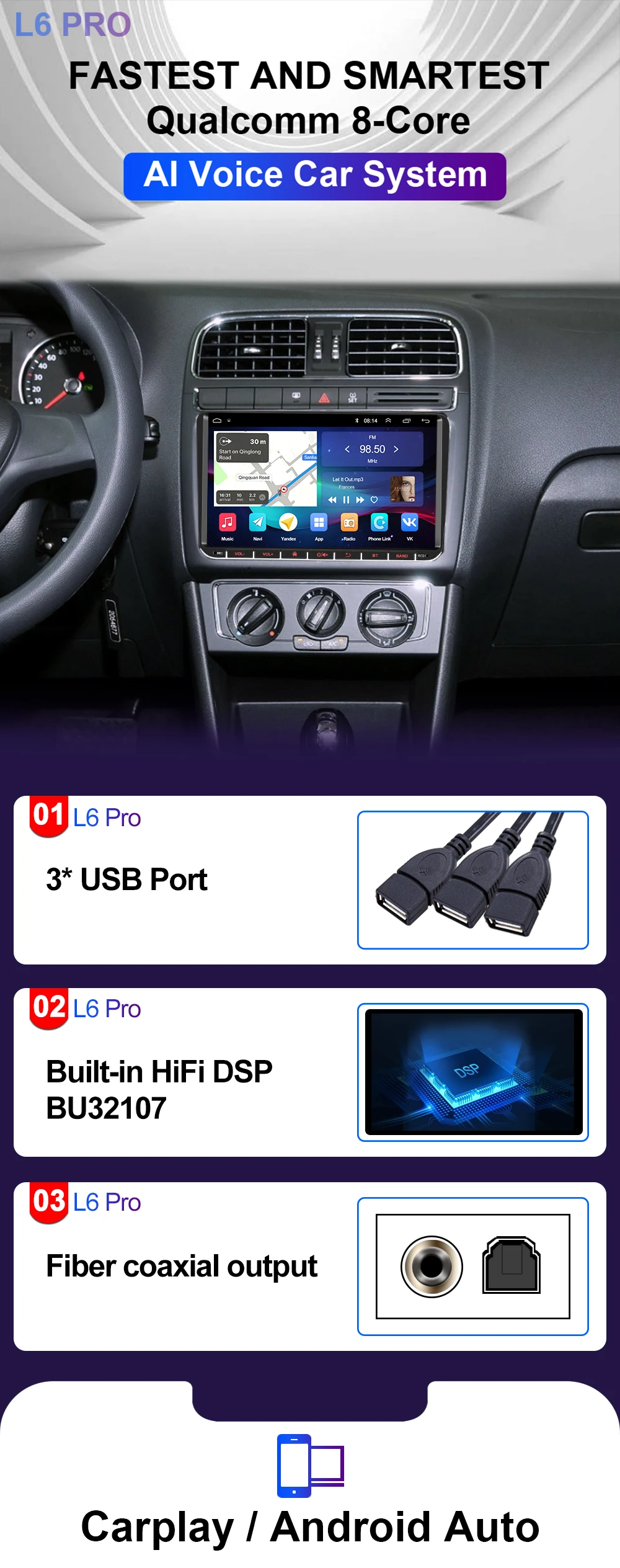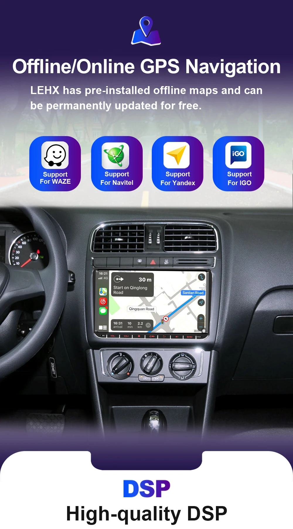 LEHX Pro 5.1 channel DSP, equipped with DTS HiFi digital audio authorization. Surround sound, Trubass, Phantom Center and other modes to achieve 5.1-channel surround sound. This technology can adjust the surround sound up and down, greatly reduce its own noise, maximize the sound conversion effect, and let you enjoy high-quality music performances in the car.