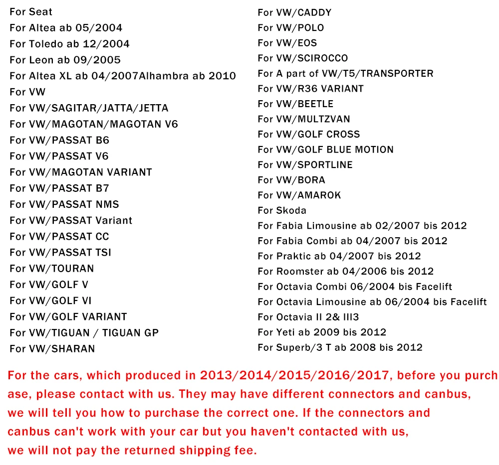 For the cars, which produced in 2013/2014/2015/2016/2017, before you purchase, please contact with us. They may have different connectors and canbus, we will tell you how to purchase the correct one. If the connectors and canbus can't work with your car but you haven't contacted with us, we will not pay the returned shipping fee.