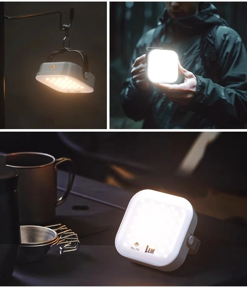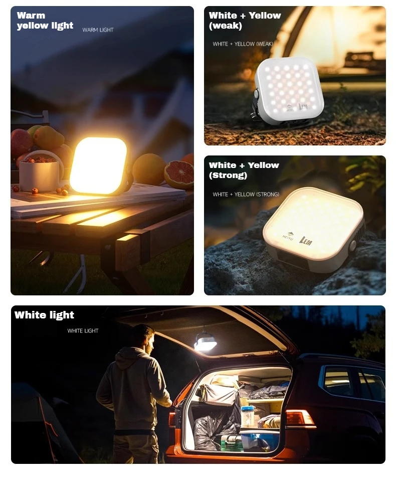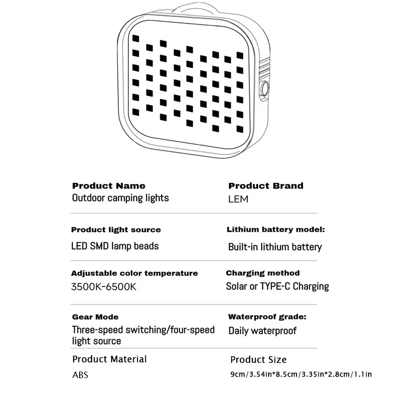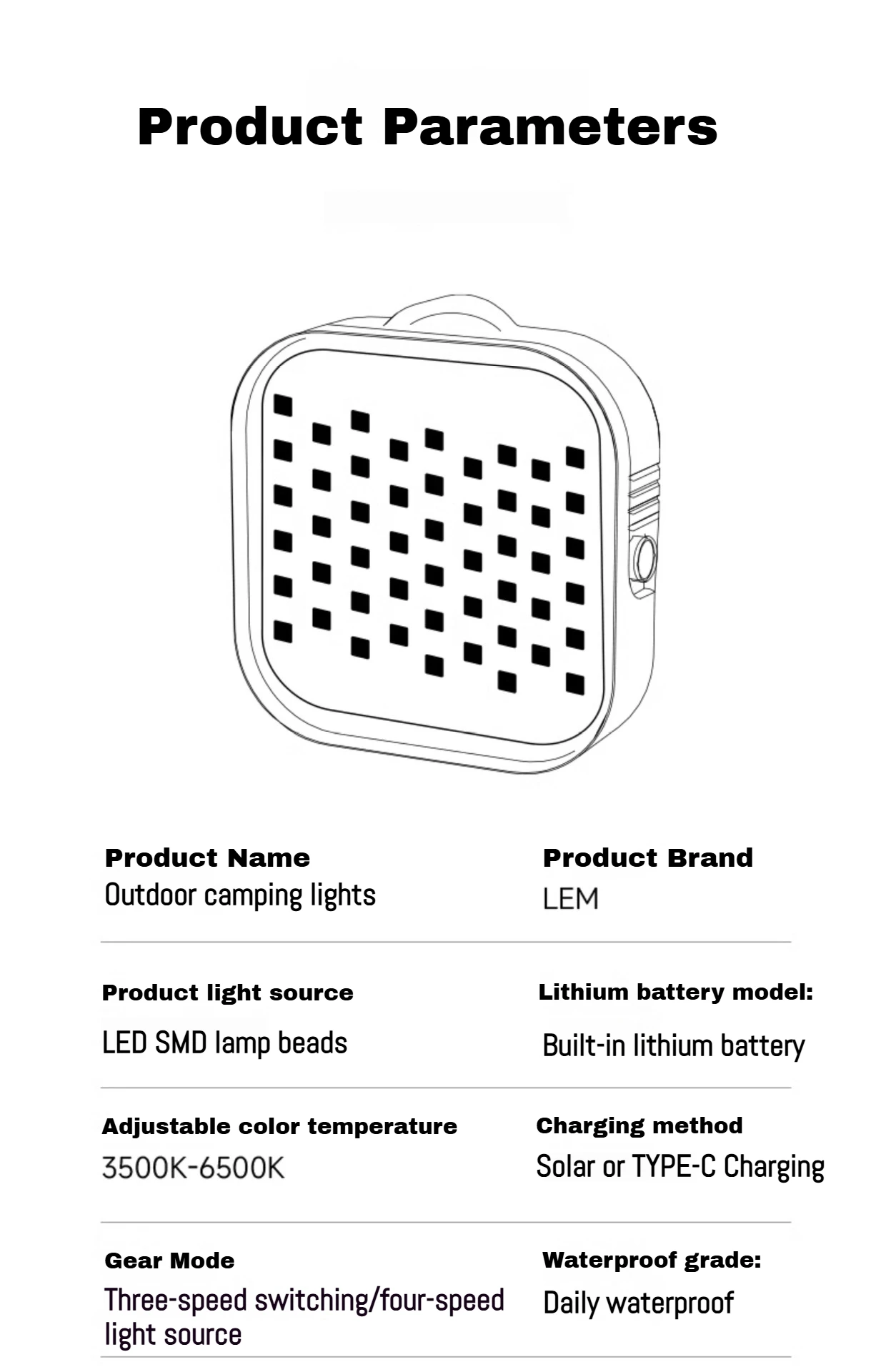 • Versatile Lighting Modes:LEM Solar Camping Light has 3 brightness levels and 4 color temperature modes (white, white + weak yellow, white + strong yellow, yellow). Easily switch via buttons to fit different outdoor scenarios, with a memory function for convenience.