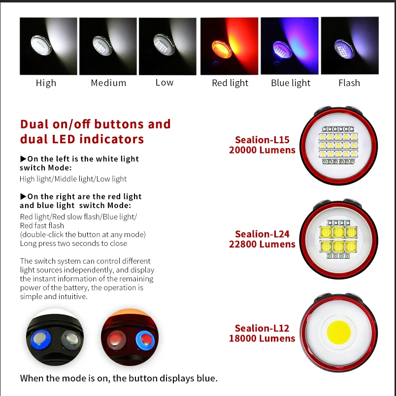 ● the light source of Sealion is composed of white light, red light and blue light, with seven modes and a maximum output of 22800 lumens (L24 model).